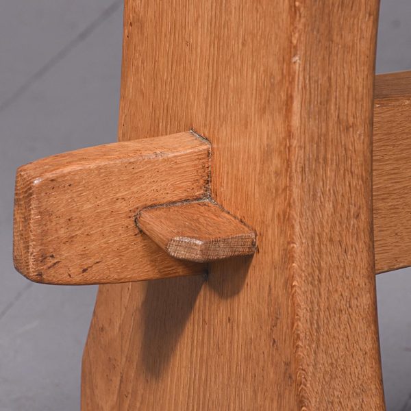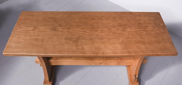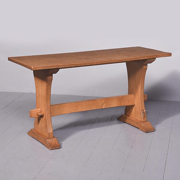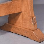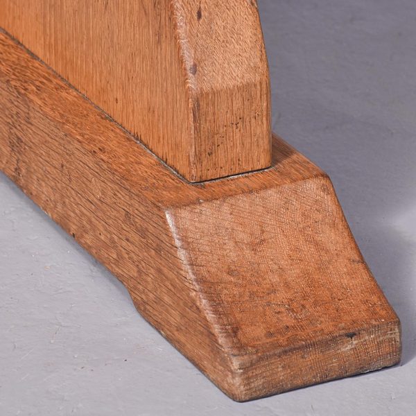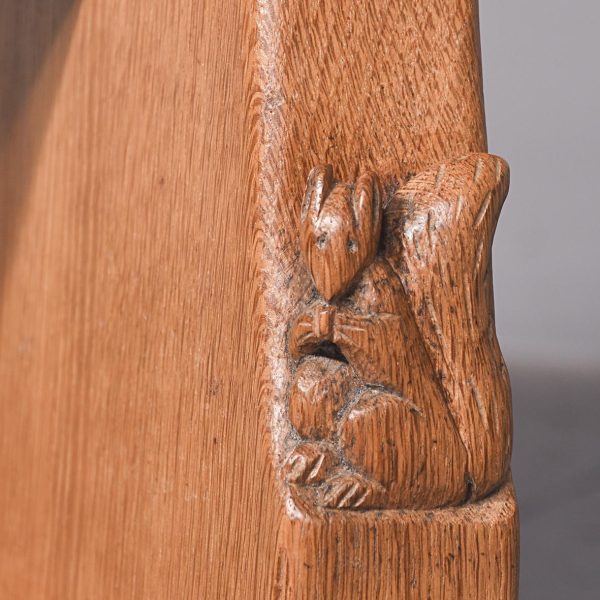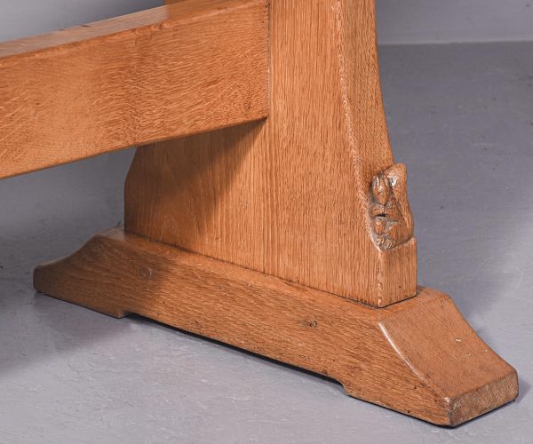 Circa 1970’s Original handmade neat-sized Squirrel man Hutchinson oak refectory table. The adzed top made of a single thick piece of beautifully figured oak supported on shaped trestles (with carved squirrel on one trestle) with pegged construction over neat pedestal bases, in excellent condition.