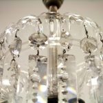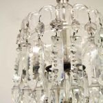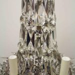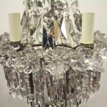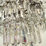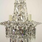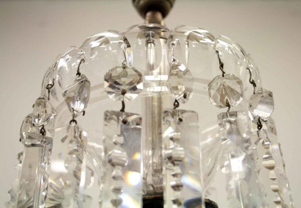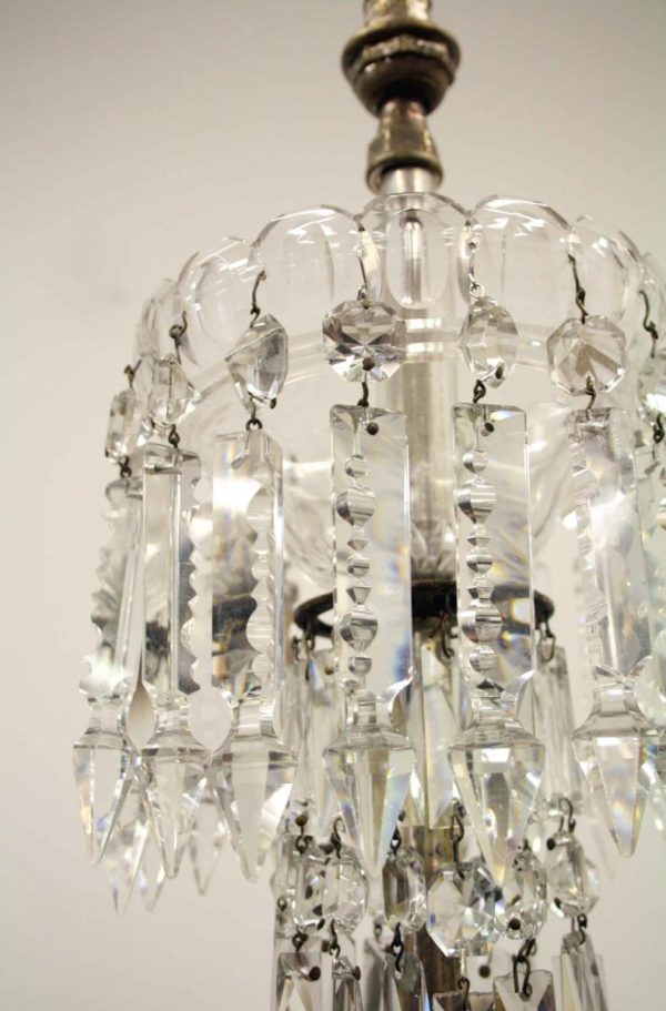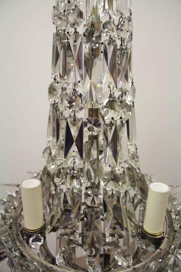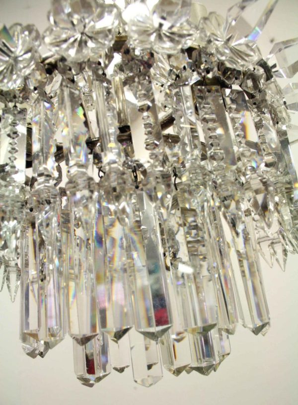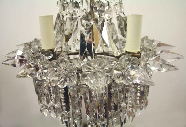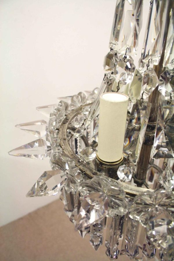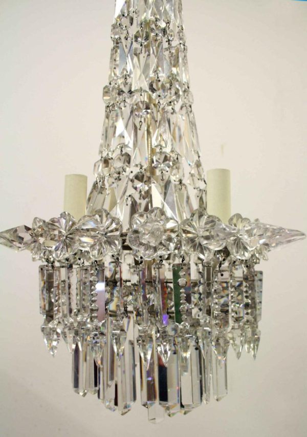 Circa 1900. Very stylish Osler-style crystal chandelier. The shaped circular glass crown with crystal pearls and drops, above an elongated tapering crystal bag made up of a combination of crystal studs, and drops, above a large circular frame with an outer pattern of diamond heads with foliate back plates and three lamp holders which have been re-wired for electricity. The base with three layers of crystal drops which taper inwards in a waterfall effect.