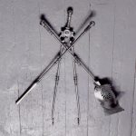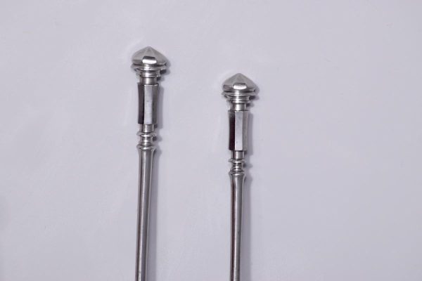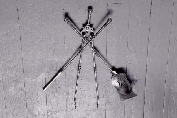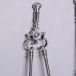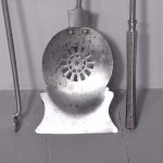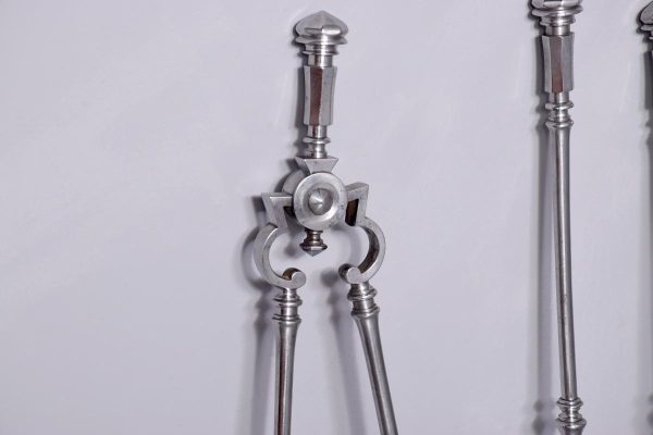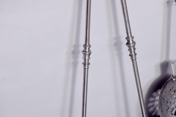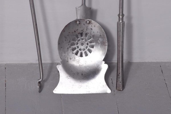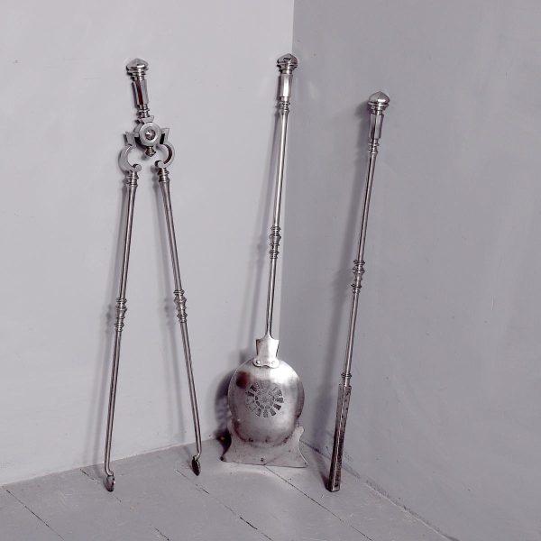 Circa 1870. Outstanding set of polished steel early Victorian fire irons. With hexagonal knobs and tops and ring-turned shafts. The shaped shovel with open fret decoration. All in perfect condition.