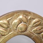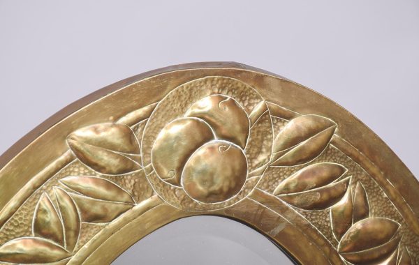 Circa 1890. A stylish Art Nouveau brass framed wall mirror, the oval frame of embossed and planished brass, including stylish fruit designs with the brass folded over the side. The mirror retains its original bevel edge mirror (small ding in one section), can be hung either landscape or portrait