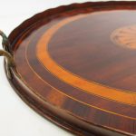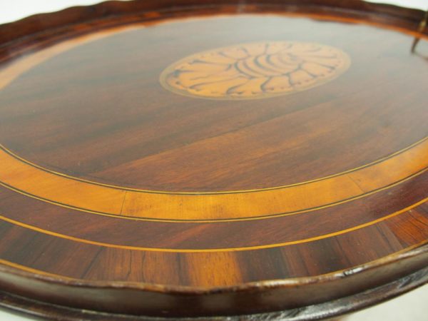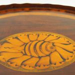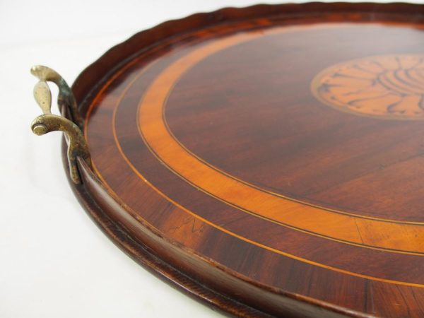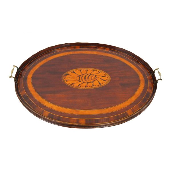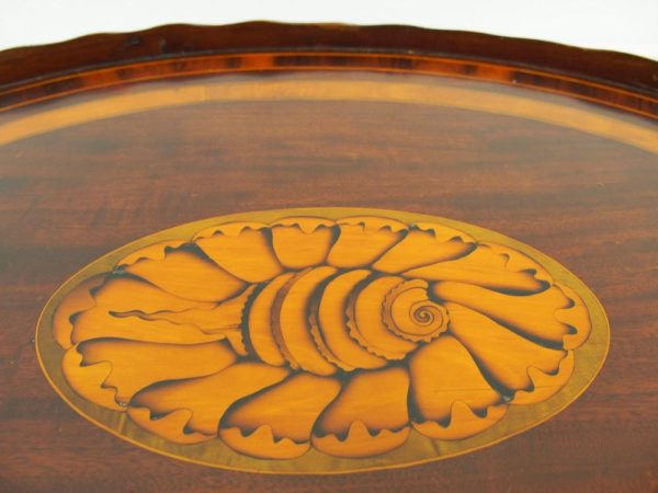 Circa 1890, large Oval Georgian style tea tray. Around the outside of the tray is a wavy gallery, and two handles with one to each side. It features a large conch shell inlay in the centre with satinwood and rosewood banding. A boxwood and ebony inlay curves around the periphery, following the shape of the tray. It retains its original colour and patina.