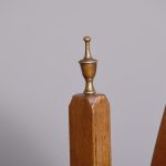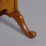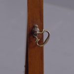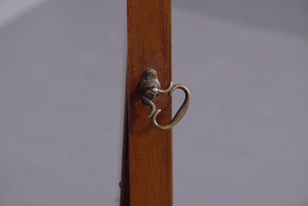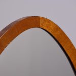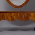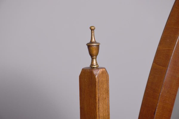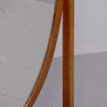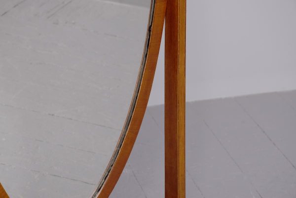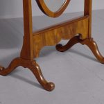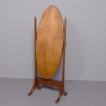 Circa 1920s. A stylish oval mahogany cheval mirror in a mahogany frame supported on two uprights with reeding on the fore-edge surmounted by brass finials in the form of urns, the mirror held in place by a pair of cast brass axe-head drops, beneath the mirror is a shaped frieze, with flame mahogany facing, supported on two uprights, all resting on four trestle feet with curled toes.