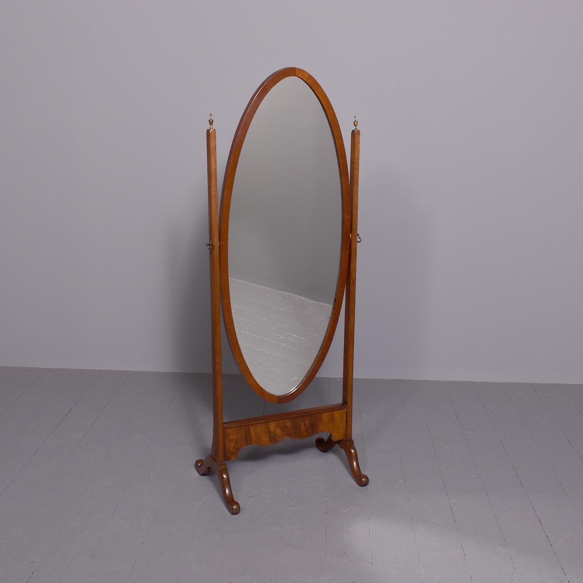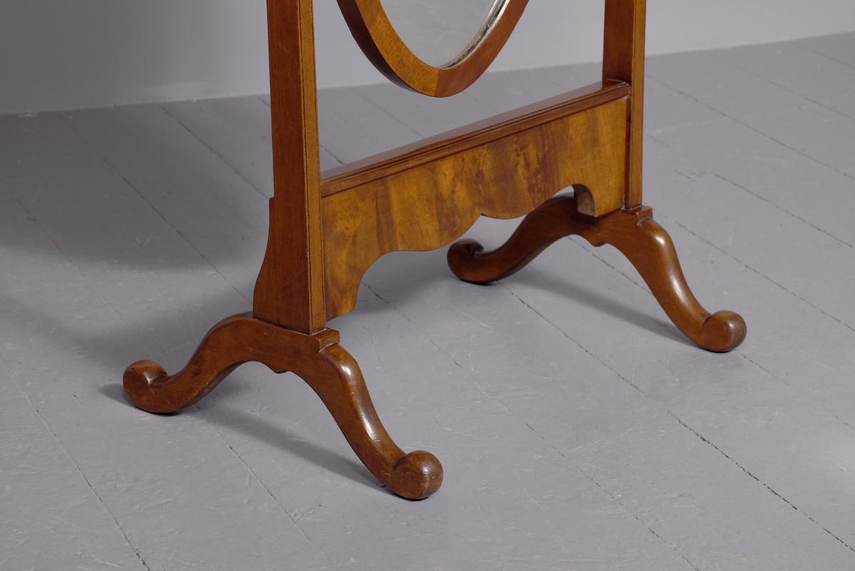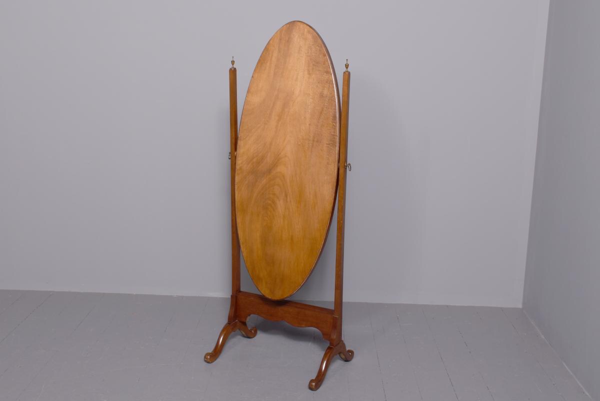 Circa 1920s. A stylish oval mahogany cheval mirror in a mahogany frame supported on two uprights with reeding on the fore-edge surmounted by brass finials in the form of urns, the mirror held in place by a pair of cast brass axe-head drops, beneath the mirror is a shaped frieze, with flame mahogany facing, supported on two uprights, all resting on four trestle feet with curled toes.