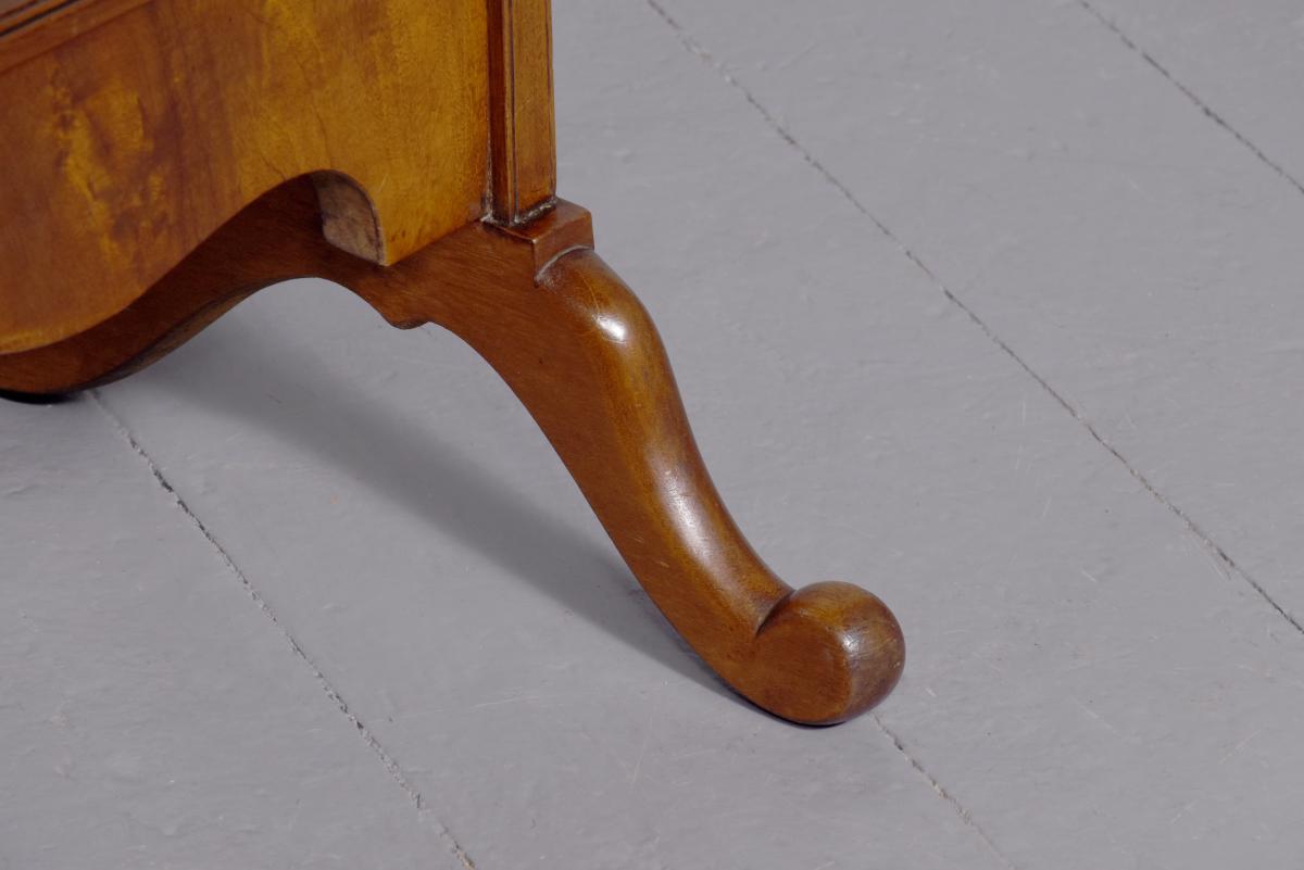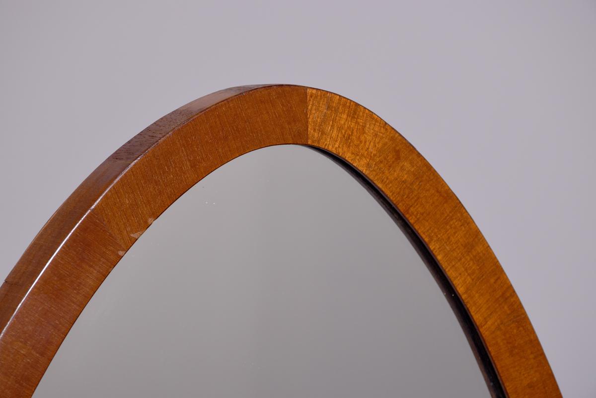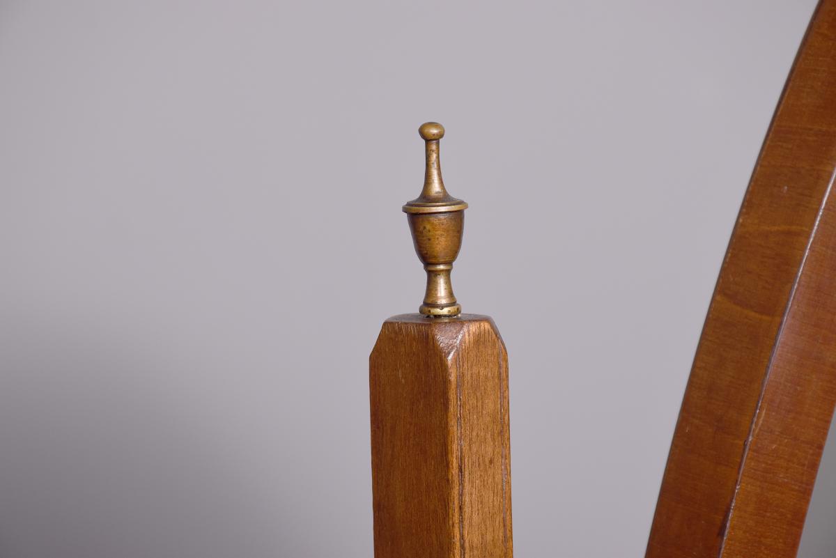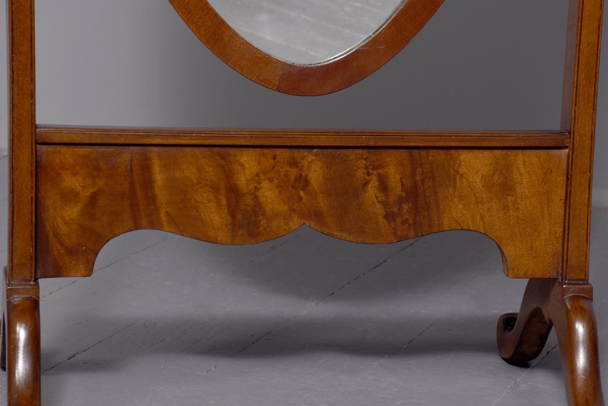 Circa 1920s. A stylish oval mahogany cheval mirror in a mahogany frame supported on two uprights with reeding on the fore-edge surmounted by brass finials in the form of urns, the mirror held in place by a pair of cast brass axe-head drops, beneath the mirror is a shaped frieze, with flame mahogany facing, supported on two uprights, all resting on four trestle feet with curled toes.