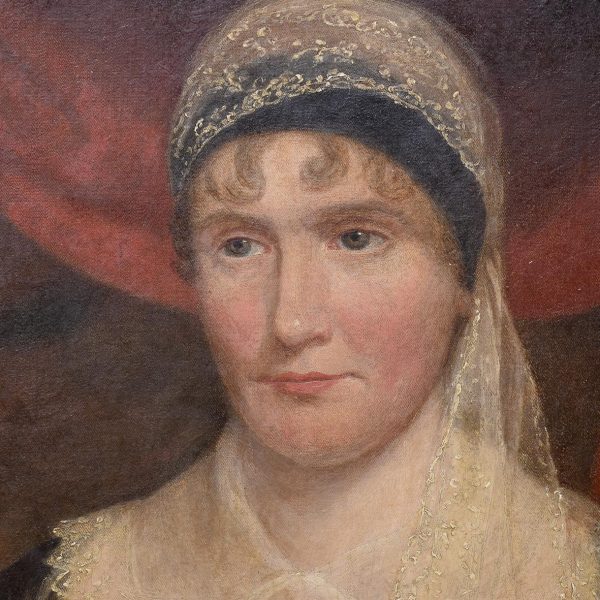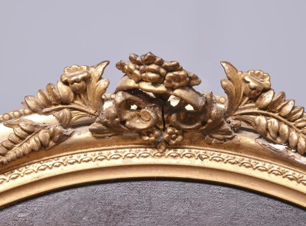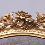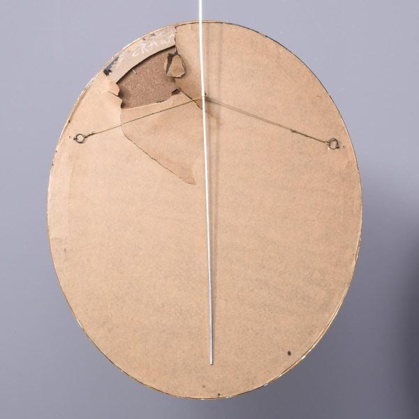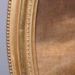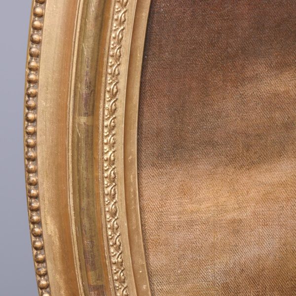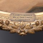 Circa 1840. An oval oil painting of a lady contained in a gilt frame. The oil on canvas which has been laid on a board for protection, depicts a seated lady with a headdress with elegant curtains in the background. There is a small brass plaque in the bottom, “Elizabeth Wardrop, wife of David Crawford of Cessnock Bank”. The oval painting is contained in a gilt frame with a simple concave section, further carved and gilded mouldings on the outside finished with a fine beading. The top is surmounted by a foliate casting with smaller similar on the bottom.