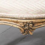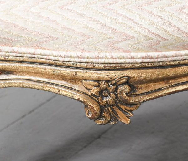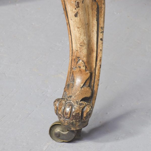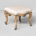 Circa 1850. An early Victorian painted and upholstered cabriole leg stool. Provenance ex Rossi Priory, Perthshire, top covered in a zig zag pattern held in place by double piping on the shaped sides. The seat rail with foliate carving on all sides, the stool rests on four well-formed cabriole legs with foliate carving on the knees and C and S scrolls to the back of the legs coming down onto a well-formed foot with further foliate carving on the facing and sitting on four cast brass feet.