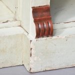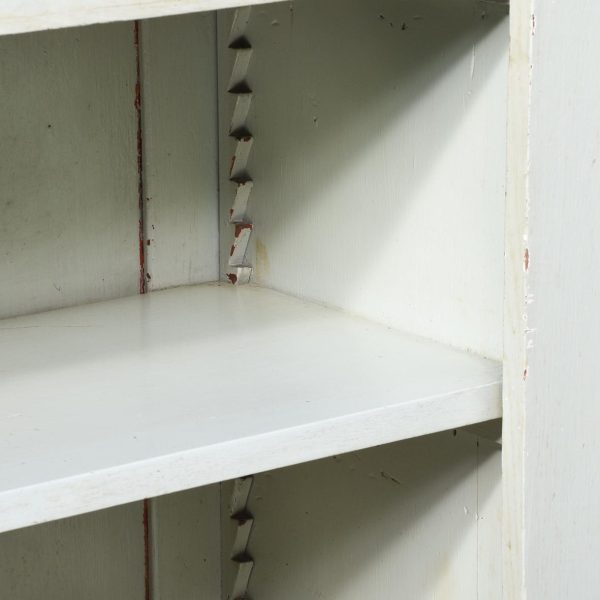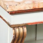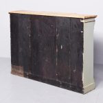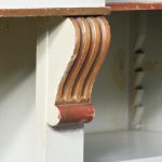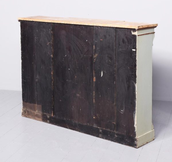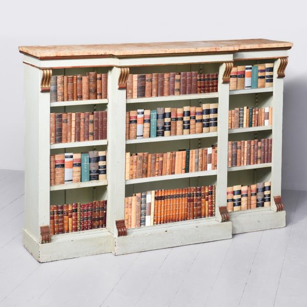 Circa 1825. George IV painted breakfront floor standing bookcase. The top with faux variegated pink marble, with simple fore edge and frieze, each section has three adjustable shelves, with carved gilded and red painted corbels to the top of each section and similar carving on the base. The inside of the bookcase and all the facings painted in duck egg green, resting on an enclosed plinth.