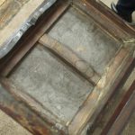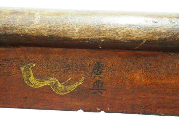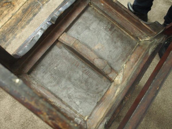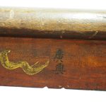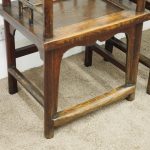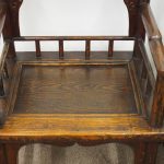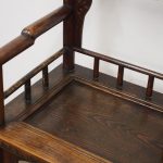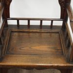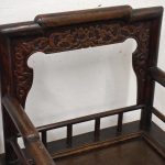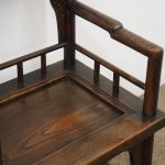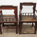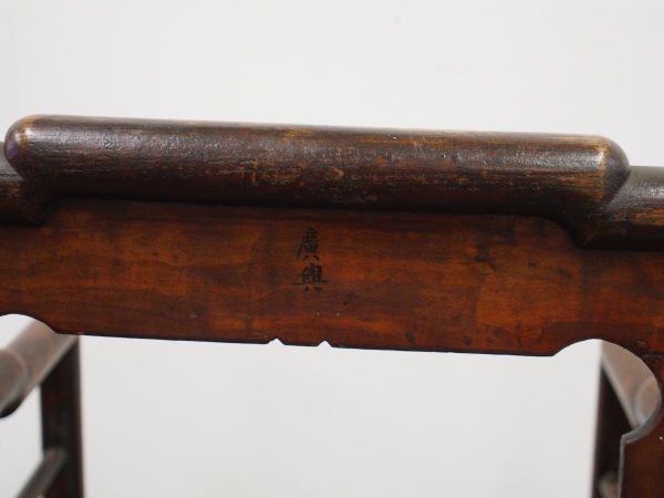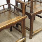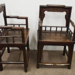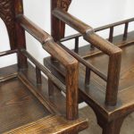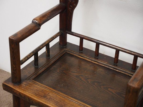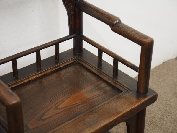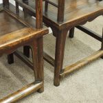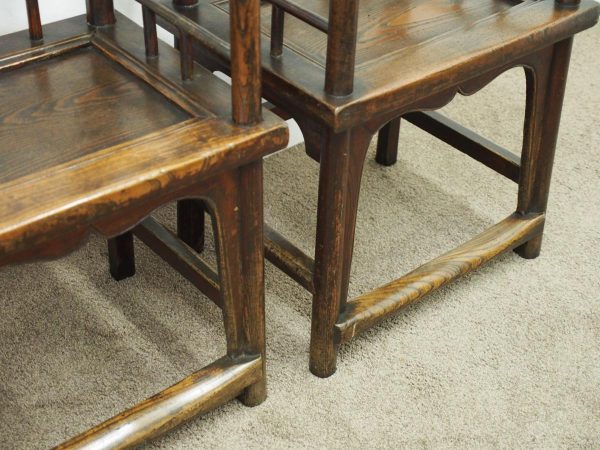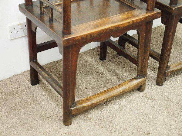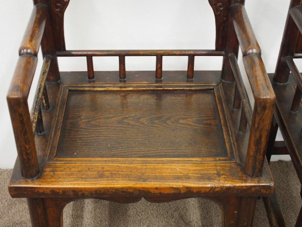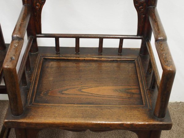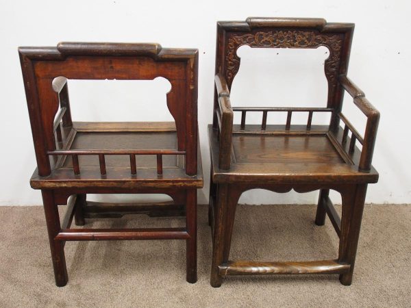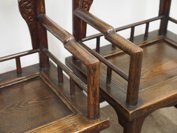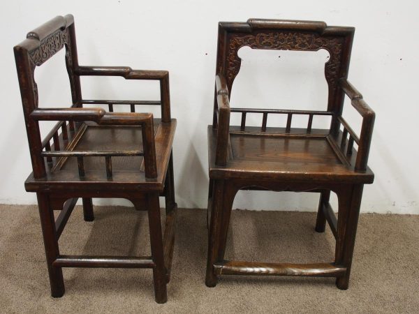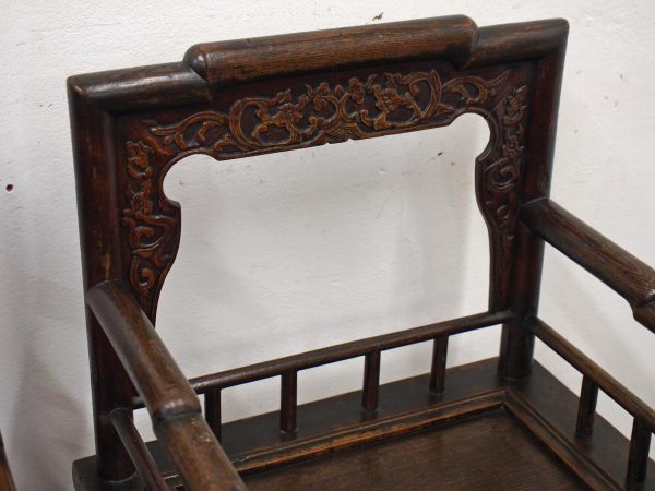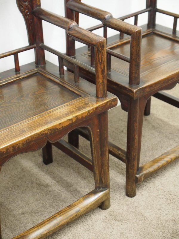Circa 1850, Pair of antique Chinese armchairs. The stepped rounded top rail leads on to rounded supports and they have an open back with floral carved moulding. The stepped rounded arms are over a lower, spindle-supported rail. With an inset panel seat in a moulded frame; the carved apron below the seat rail extends down to the turned supports. These are all connected by peripheral stretchers. There are hints of the original red-tinged colour underneath.