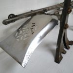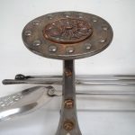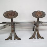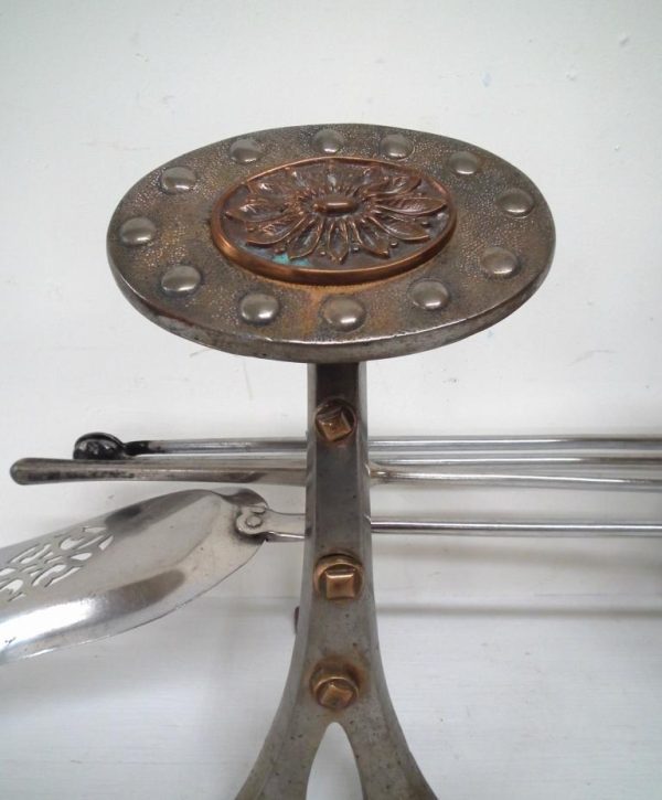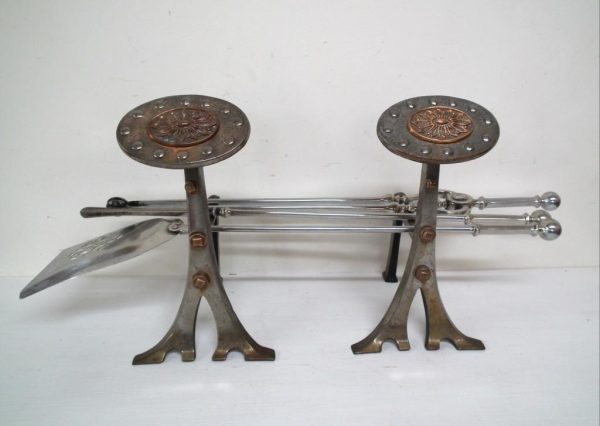 Circa 1890, pair of Arts and Crafts steel and copper fire irons and fire dogs, the irons with polished steel poker, tongs and shovel sit on the dogs with their oval top with foliate centre surrounded by a riveted and beaten panel, standing on stylised legs.