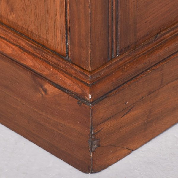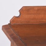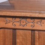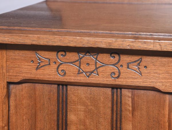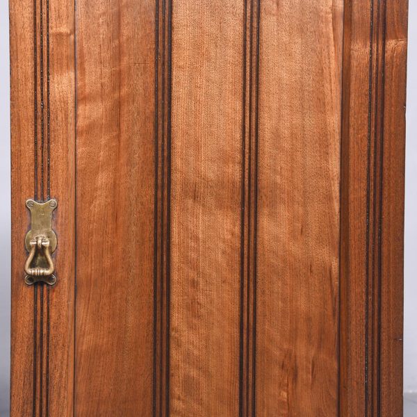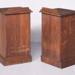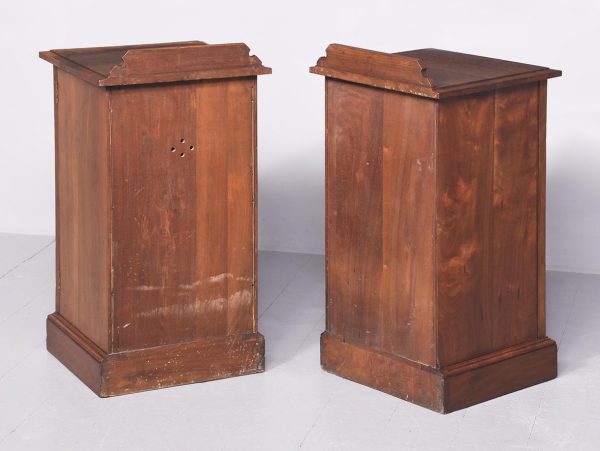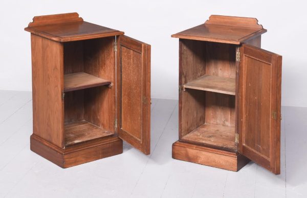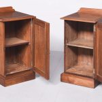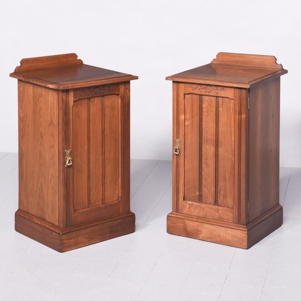 Circa 1890 A pair of Aesthetic movement walnut bedside cabinets, the solid tops with chamfered on the top and a flat fore-edge, and a shaped upright, 1 full length panel door with scratch carving on the top, reeding in the panels and on the doors, inside there is a single removable shelf, beneath the doors there is further mouldings, the pedestals rest on enclosed plinths, recently repolished (traditionally).