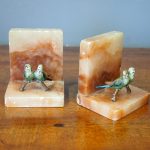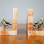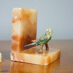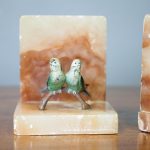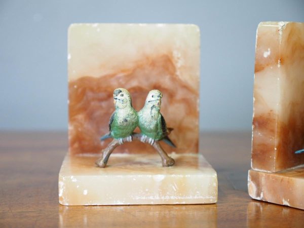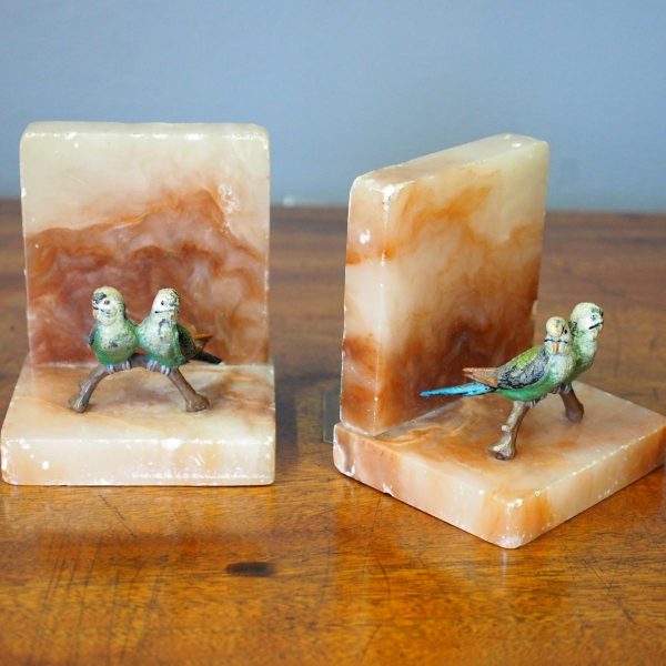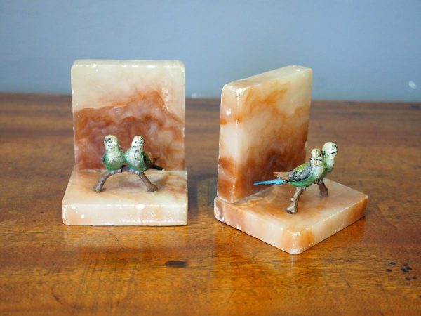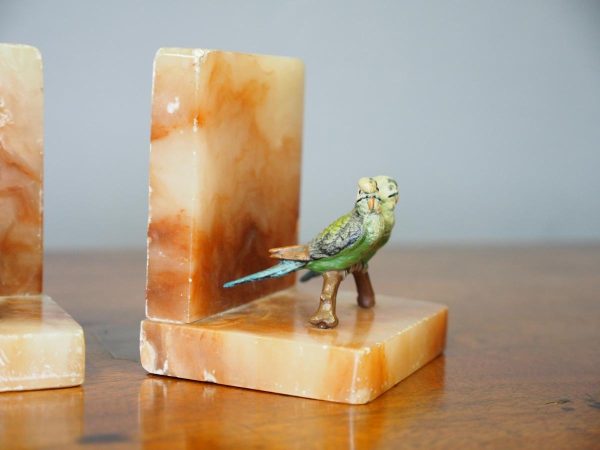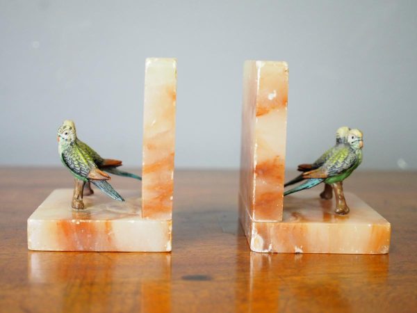 Circa 1920, unusual pair of Austrian cold-painted bronze budgerigars standing on L shaped onyx bases. An interesting pair of Art Deco book-ends.