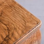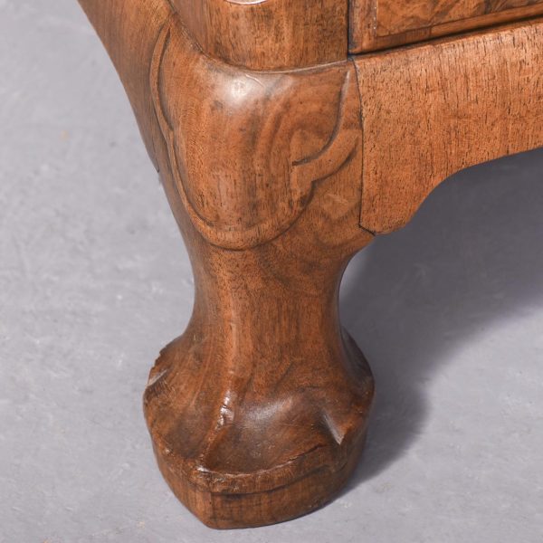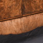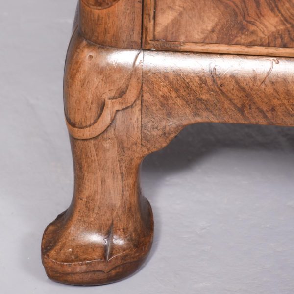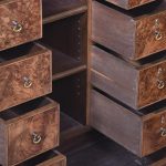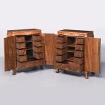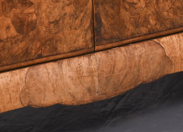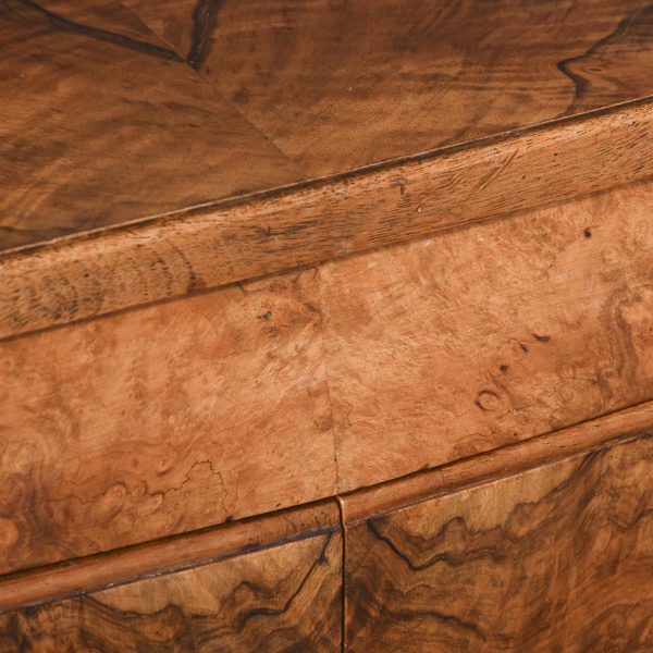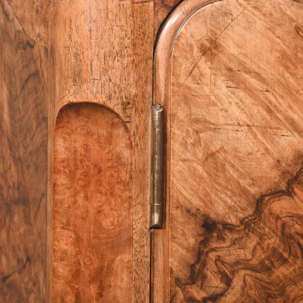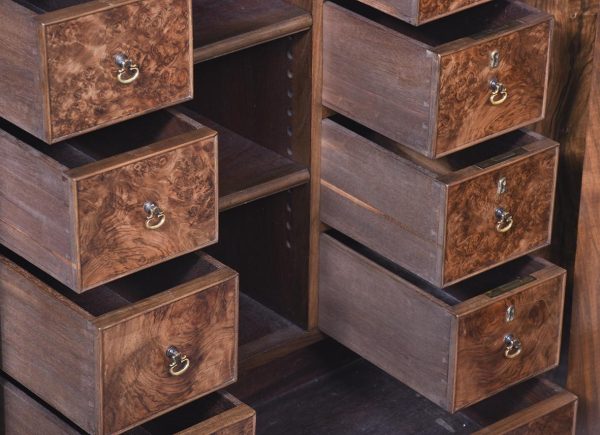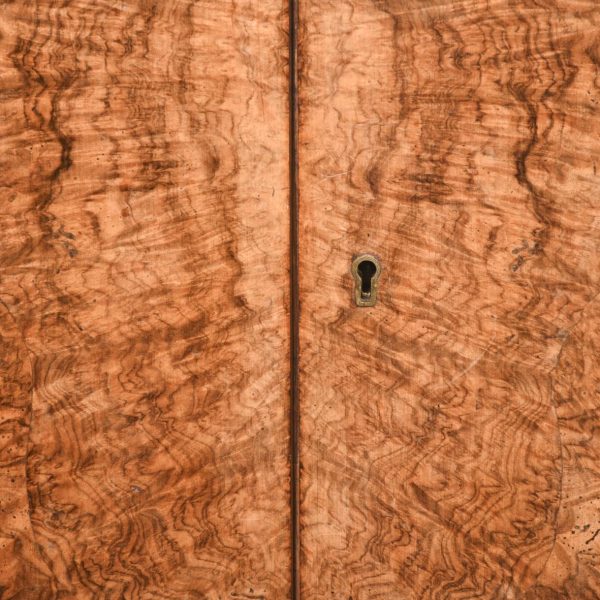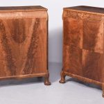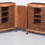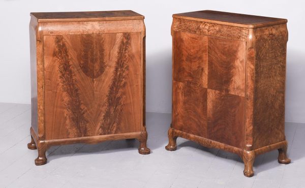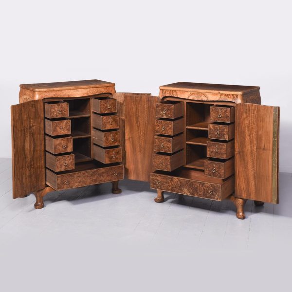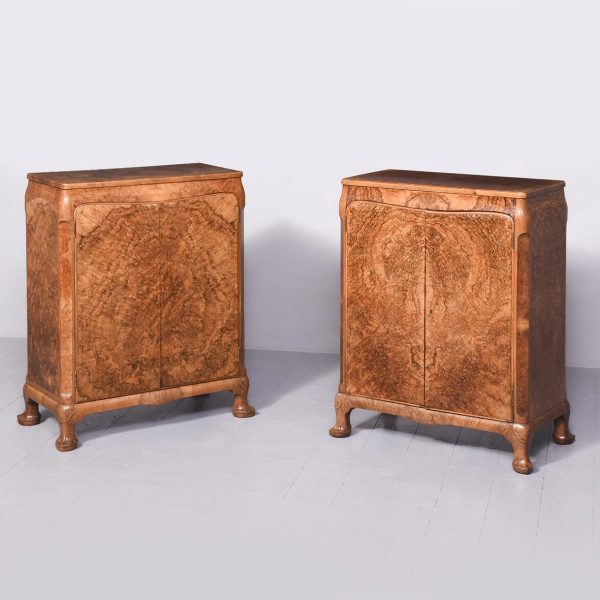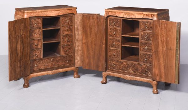 Circa 1890. A quality pair of burr-walnut and mahogany side cabinets by ‘Whytock & Reid of Edinburgh’ with many features used by ‘Sir Robert Lorimer.’ The top in the finest quartered burr-walnut tops with moulded edges above a pair of shaped doors enclosed to a well fitted interior with a range of short drawers and shelves. The cabinets with chamfered corners and a carved shaped frieze raised on stylish elongated pad feet.