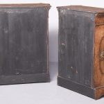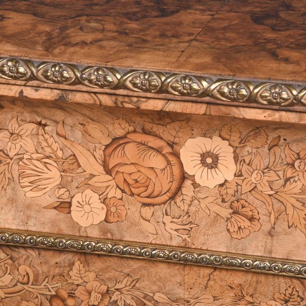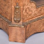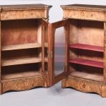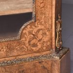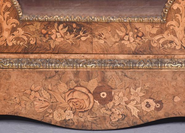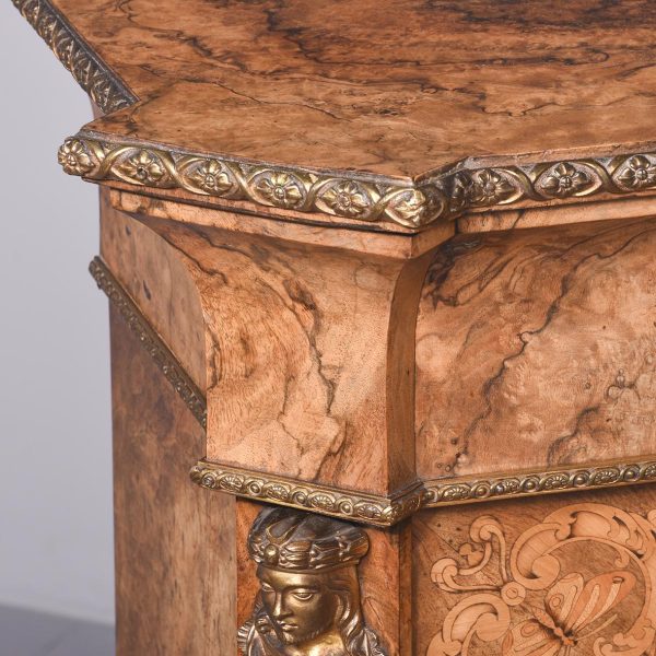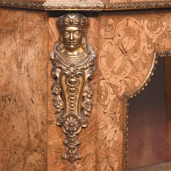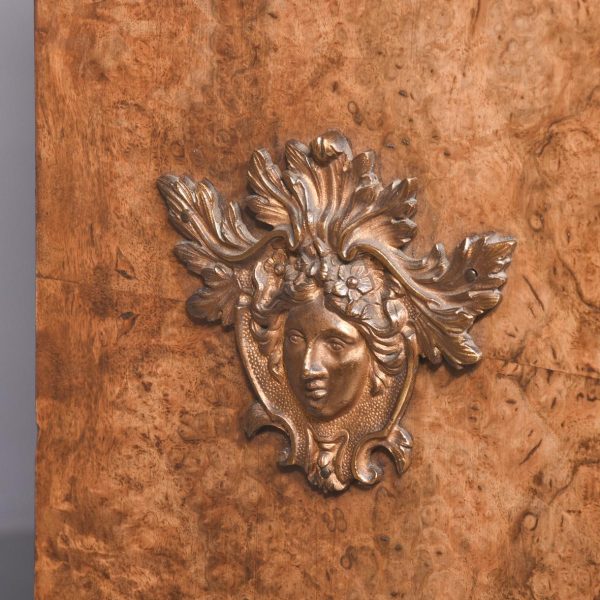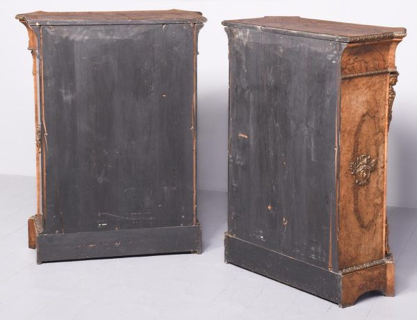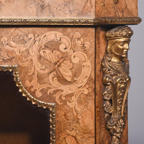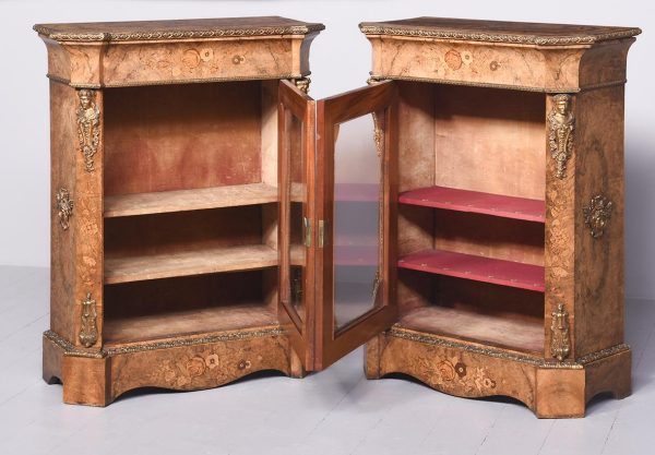 Circa 1860. An exhibition quality pair of mid-Victorian burr-walnut and marquetry pier cabinets. The book matched burr tops with outswept square corners above cavetto moulded and inlaid friezes over a single glazed door, flanked by gilt metal mounted angles, enclosing the shelf interior. The sides with ormolu mounts of a Goddess’s head, all resting on shaped plinth bases, smothered in marquetry throughout.