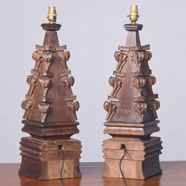 Pair of Carved Oak Gothic Lamps
