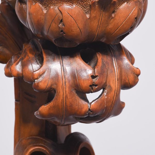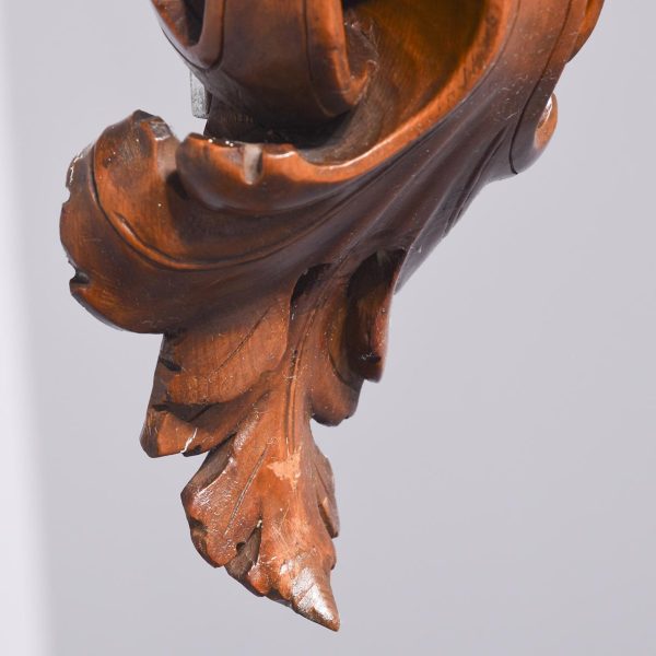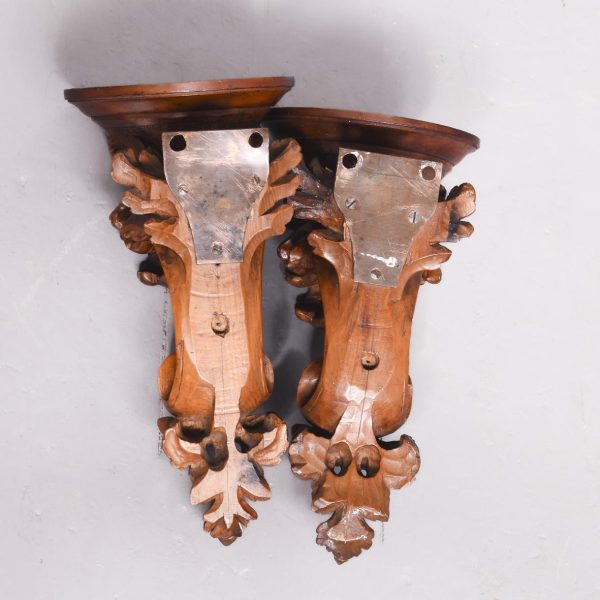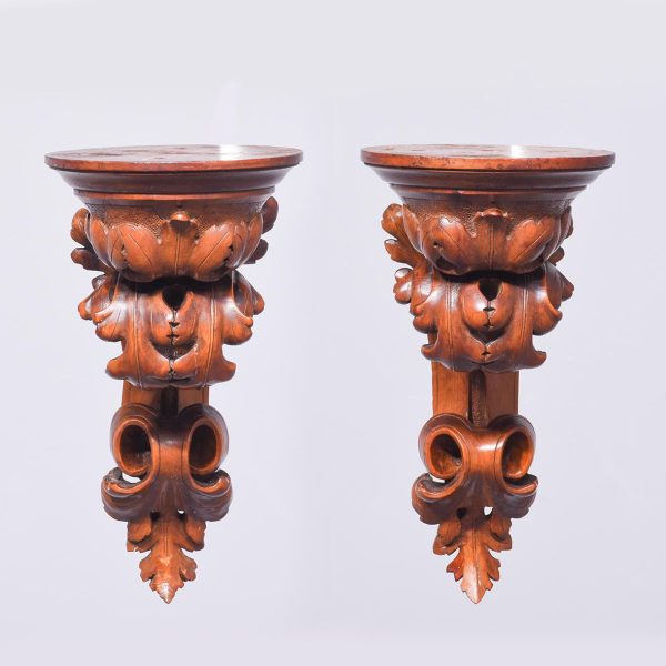 Circa 1870. A quality pair of Rococo style Mid-Victorian limewood wall brackets. Circular tops with a flat section and moulded fore edge resting on a scrolling foliate arm with leaves which are pierced. The base has a curved section and finishes with another pierced leaf, with wonderful colour and crisp carving, the brackets are attached by a pair of brass brackets to the wall.