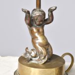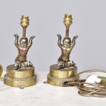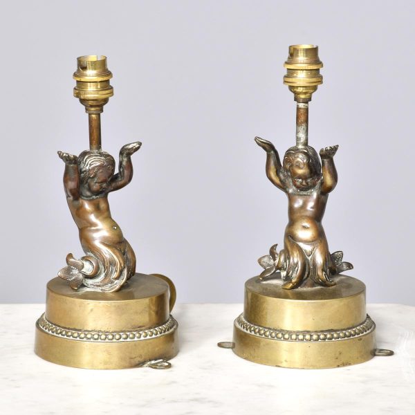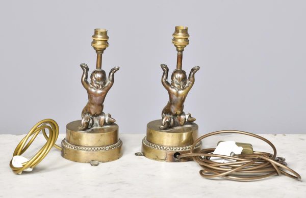 Circa 1890. A pair of cast bronze Gas lamps recently converted to electricity. Decorated with kneeling cherubs with hands raised above the head on a circular platform plinth with further beading beneath and two brass plates for fixing the lamps in position. Price includes re-wiring.