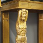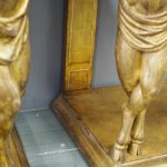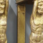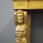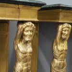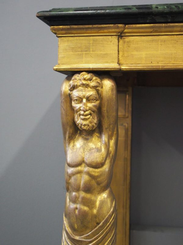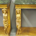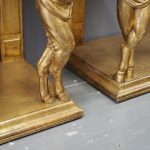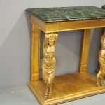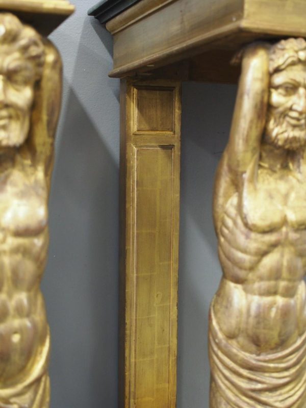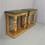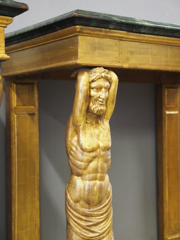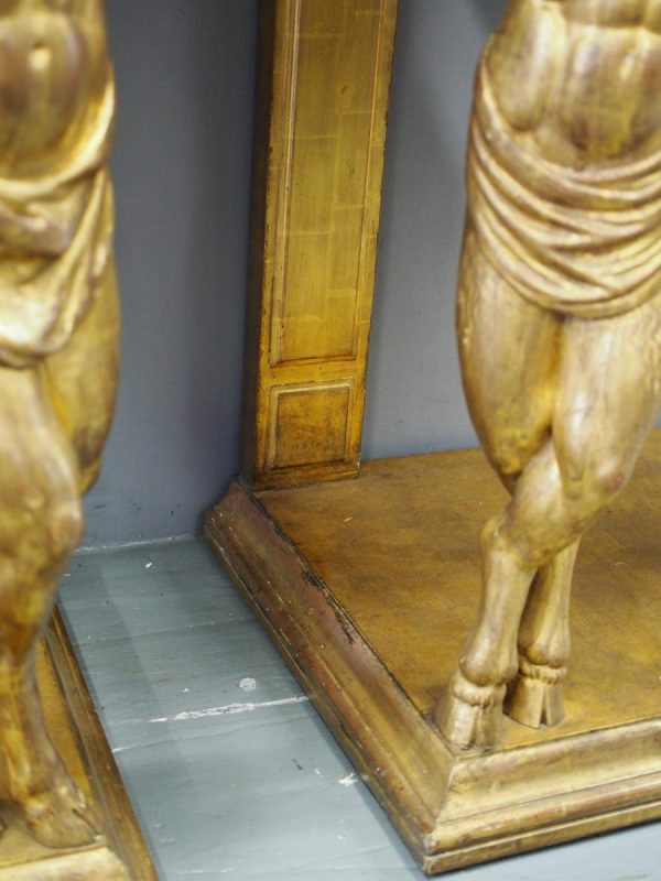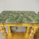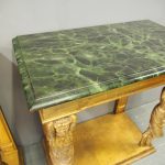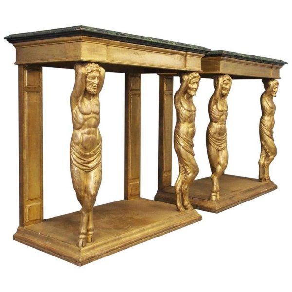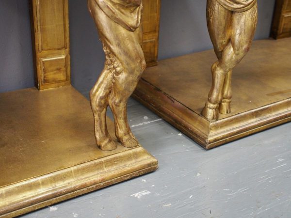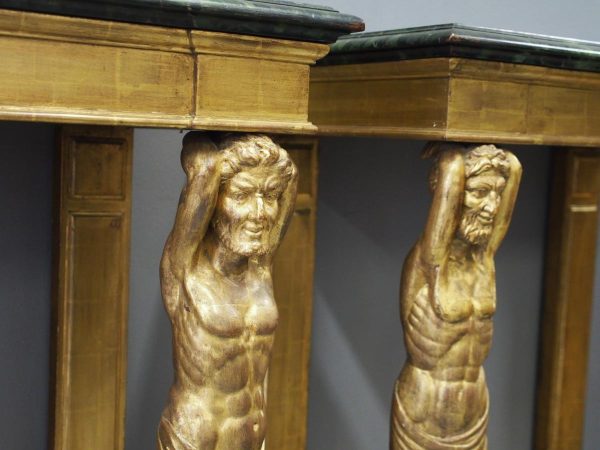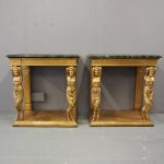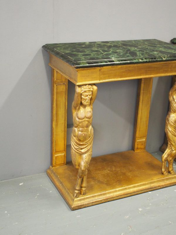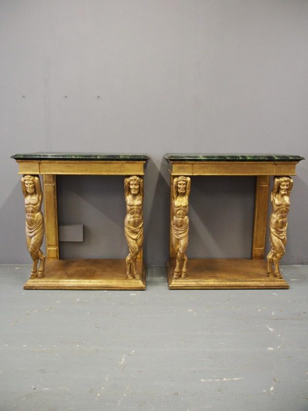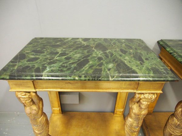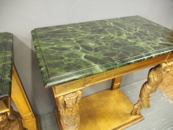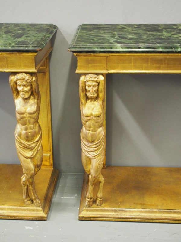 Circa 1900, pair of console tables. With rectangular green variegated faux marble tops and a gilded, shaped frieze (with marks from the sheets of gold leaf) and held in place by 2 centaurs to the front and rectangular legs with fielded panels. The bottom shelf is gilded and it stands on a moulded, enclosed plinth.
