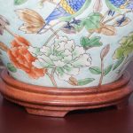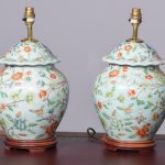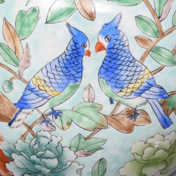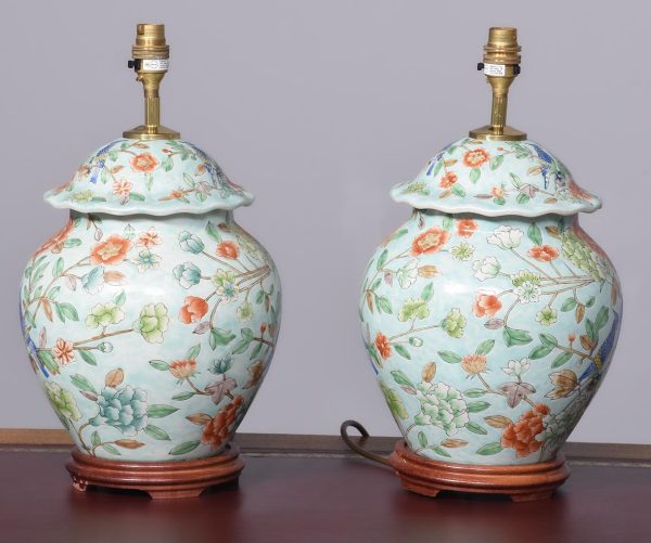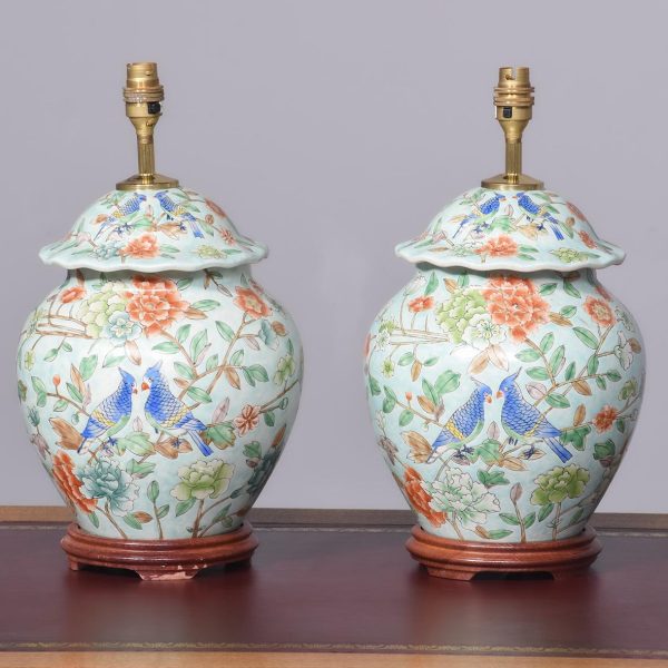 Circa Late 1900’s. Chinese Canton style lamp with a pale green background, decorated with coloured foliage and parrots with brass electrical fittings.