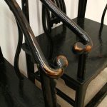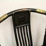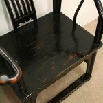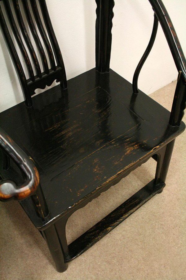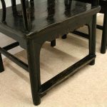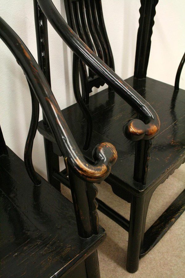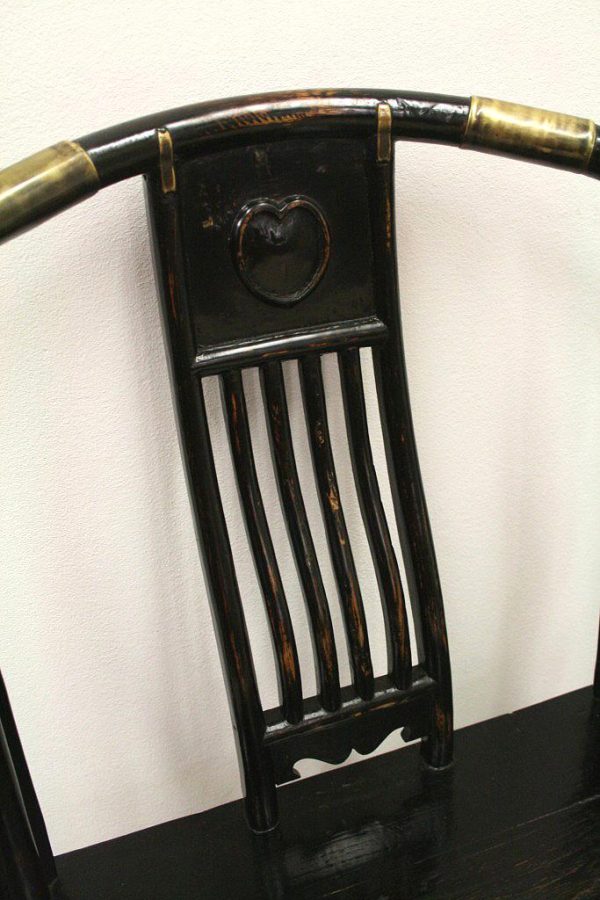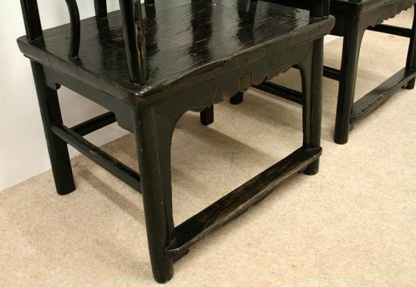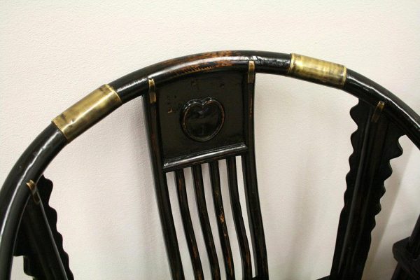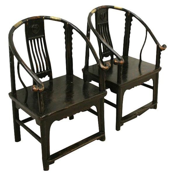 Circa 1880, pair of Chinese hardwood child’s chairs, the hoop backs with curved turned central splat and heart shaped decoration above, with scroll arms and square supports united by stretchers.