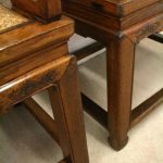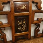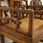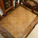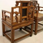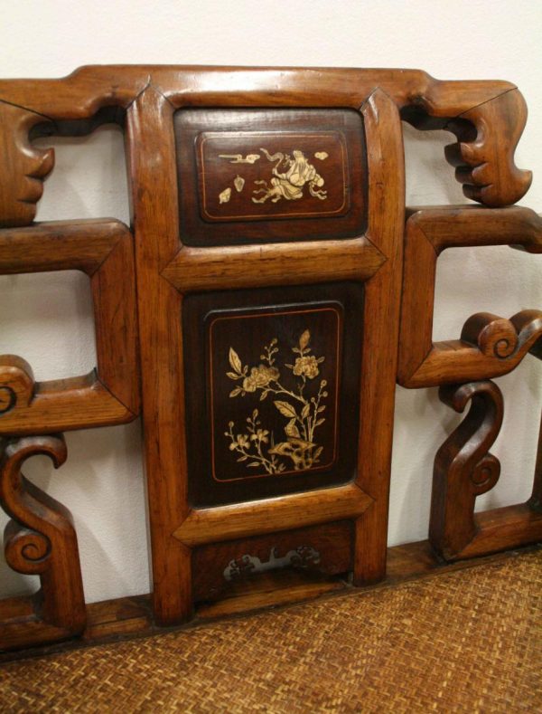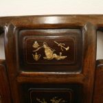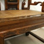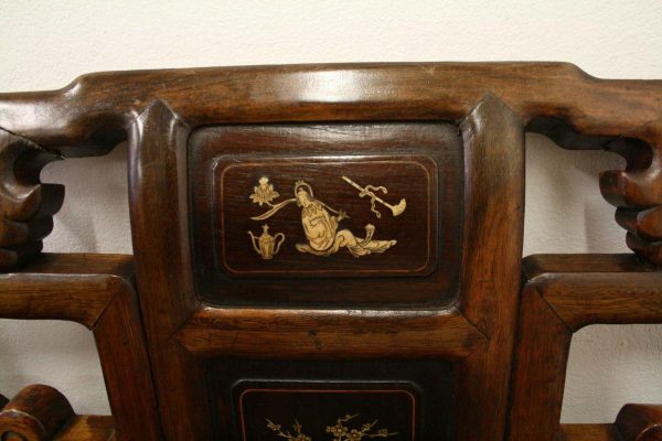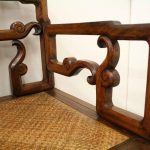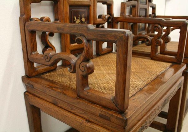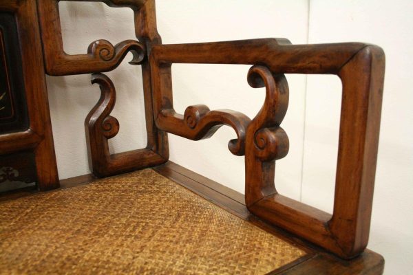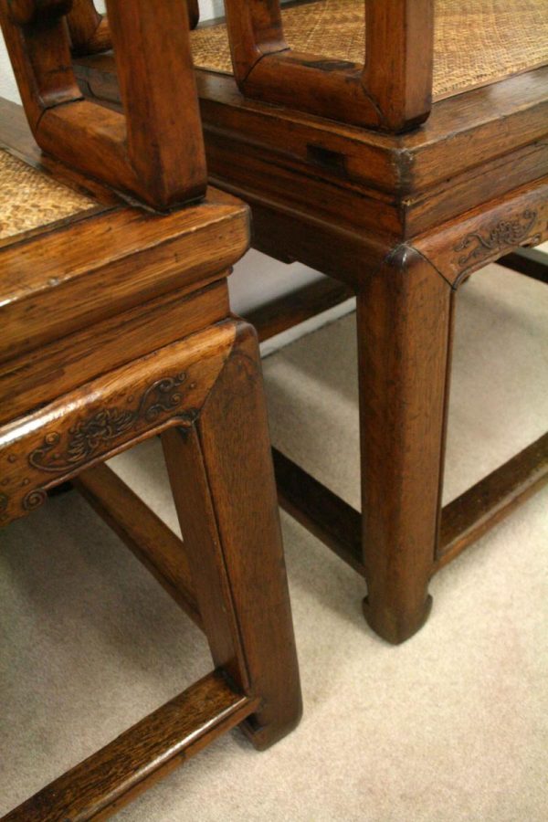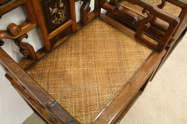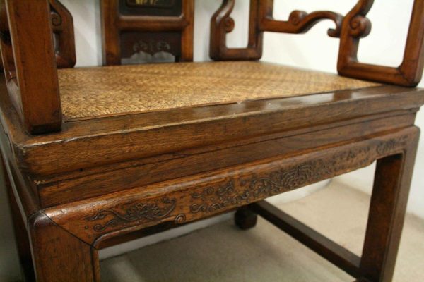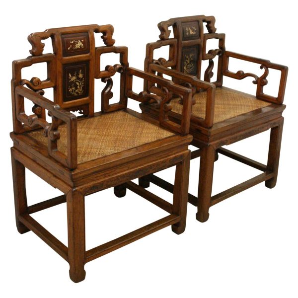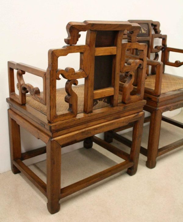 Circa 1880, very stylish pair of Chinese stained elm armchairs. The back with its 2 curved and inlaid bone panels depicting a character and flowers. Beneath the second panel there is a small quarter bracket with very stylish fretwork. To the left and right of the panels there is a series of very stylish turned wood, some in the form of bamboo and others just foliate carving. There are 2 arms that come off the back, again with a similar carving to that of the back. The seat has a rattan covering and beneath this there is a further woven section for support. The large rectangular seat has a shaped apron which is carved with a pattern of scrolls on the front. The whole piece stands on 4 large square legs with large chunky cross stretchers towards the base, finishing with a slight curve.