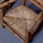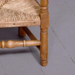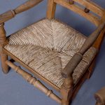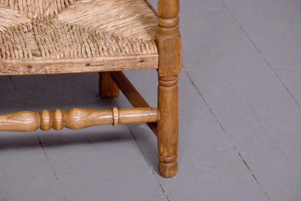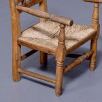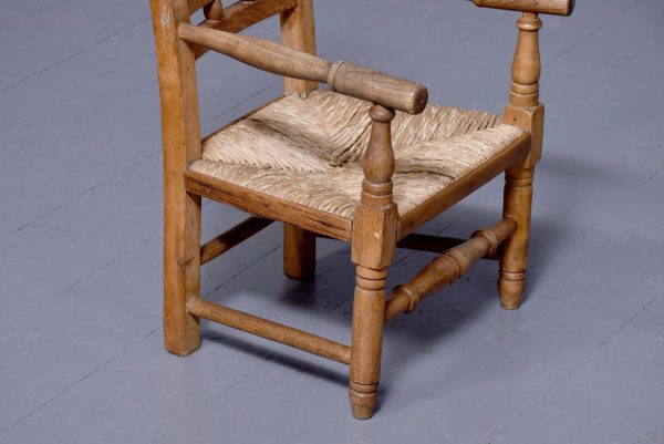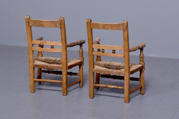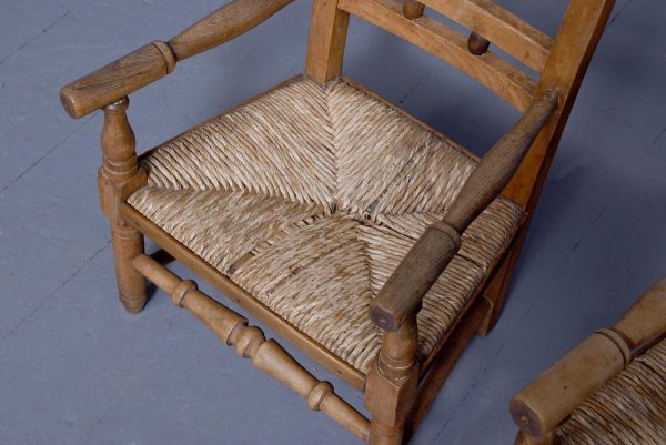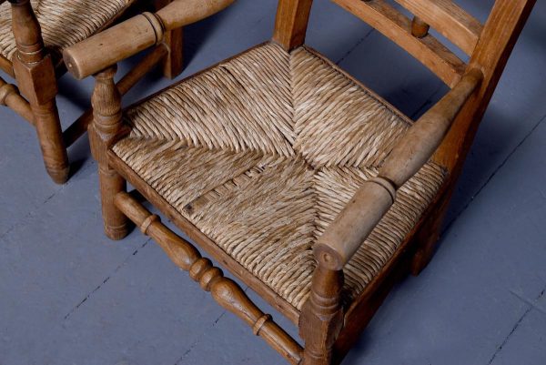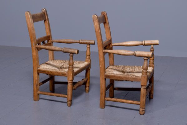 Circa 1870. A pair of neat size country made elm and beech child’s chairs, with a simple top rail, the lower back rails with two small turned sections in the center, the arms supported on simple uprights, the rush woven seats with simple facings, the back legs are square and front legs are turned and all of the legs are braced by turned stretchers