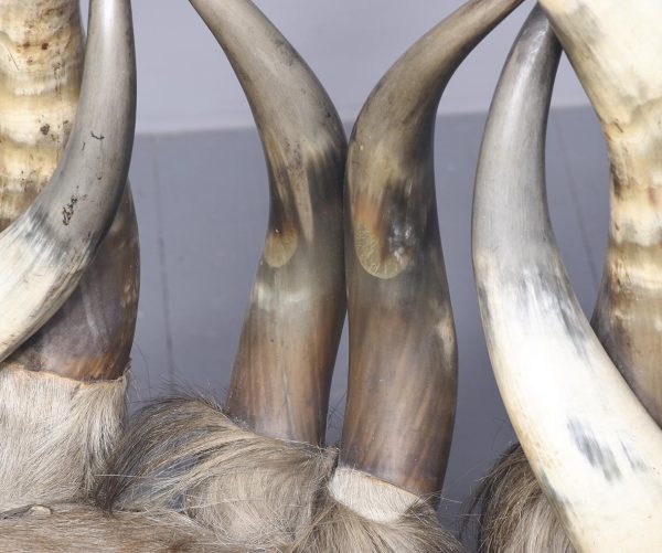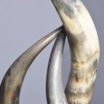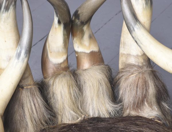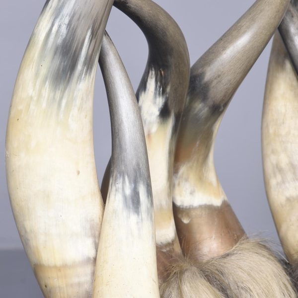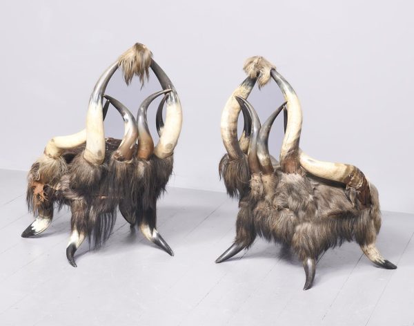 Circa 1870. Two similar American long horn easy chairs. The stylish chairs constructed with 10 various horns, forming the back, low slung arms and four shaped legs, covered to various degrees in cow hide and some in leather. The stylish and sturdy chairs look great. (Upholstery needs attention)