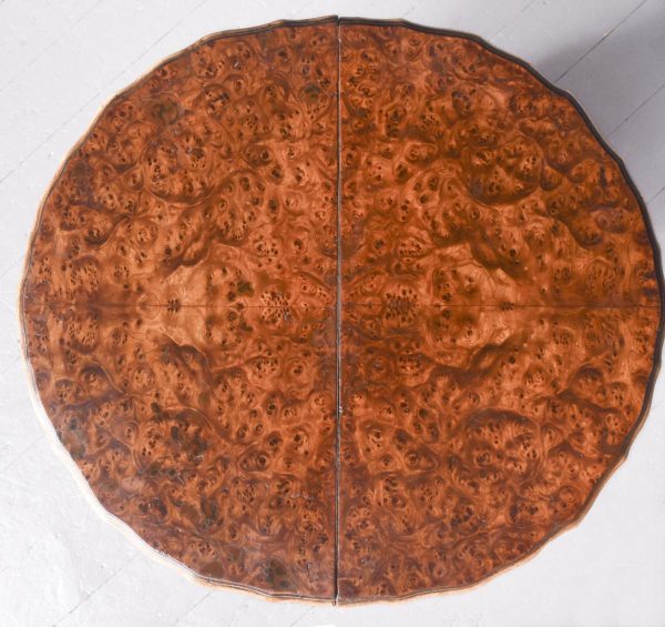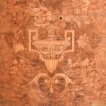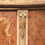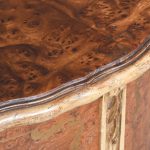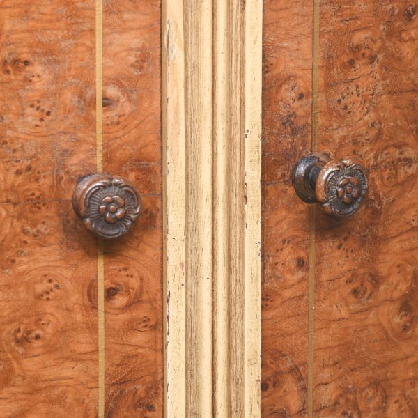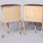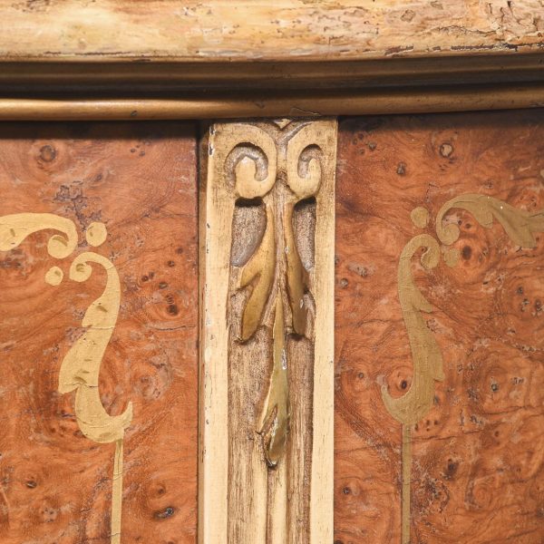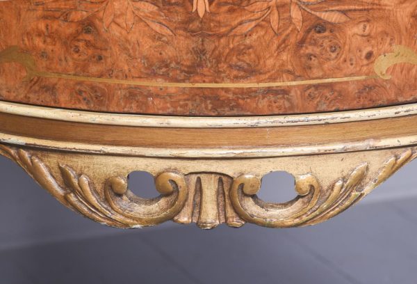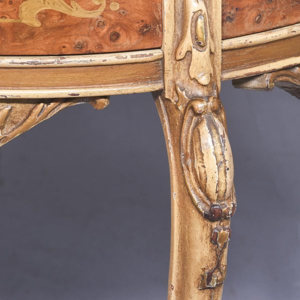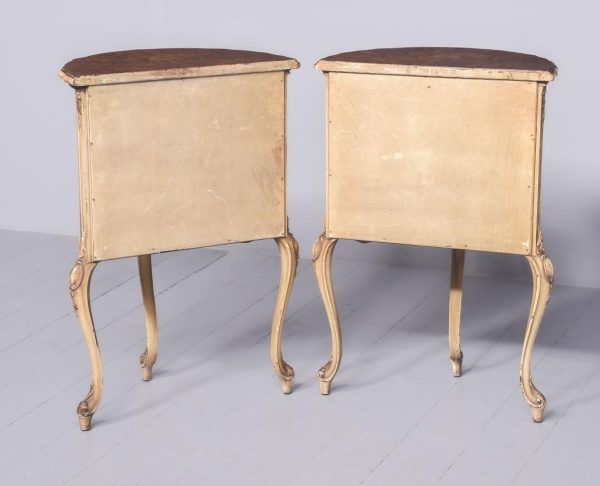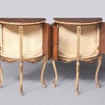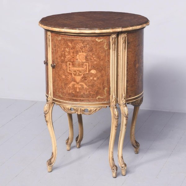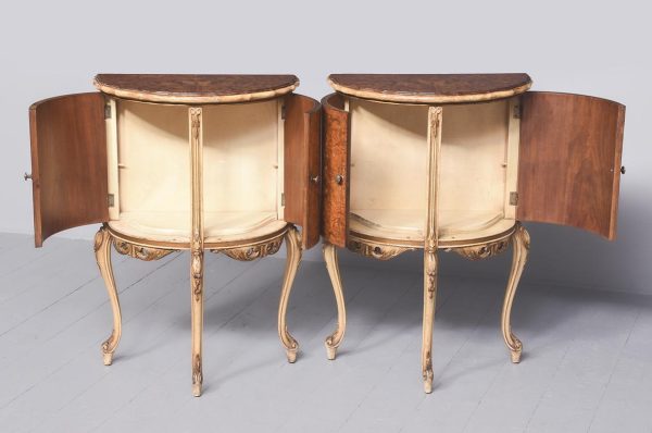 Circa 1920. A quality pair of continental marquetry and painted side tables/cabinets. The book matched burr walnut veneer demi lune tops, with a moulded pie crust fore-edge above two curved doors with marquetry panels of flower vases, with foliate carved aprons, resting on three elegant scrolling cabriole legs.