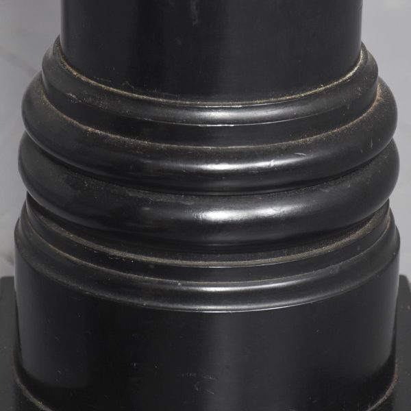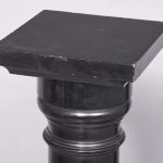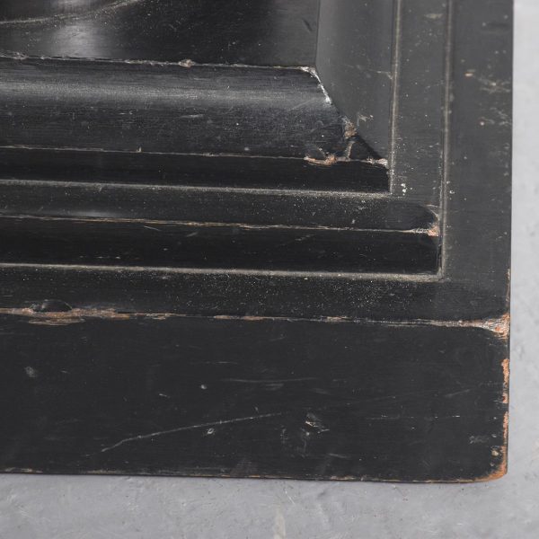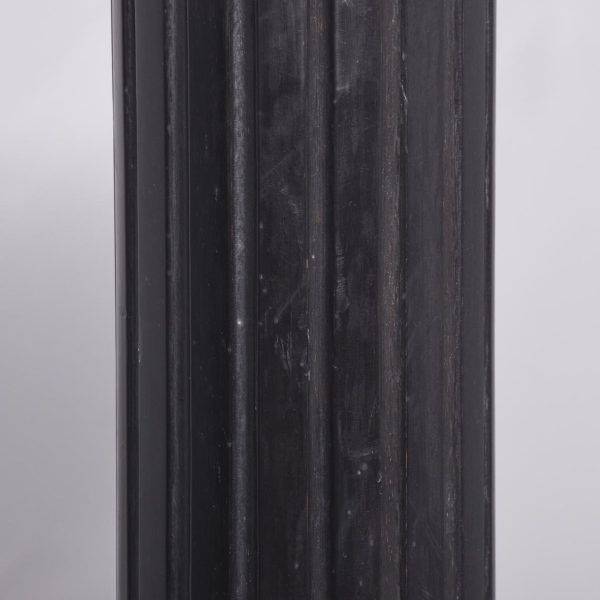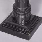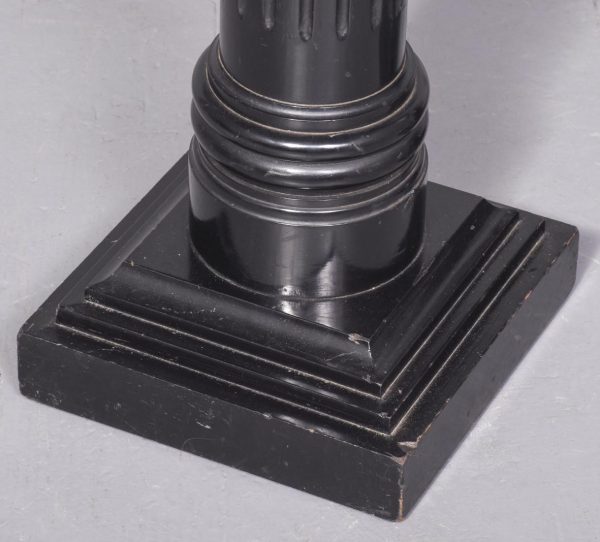 Circa 1900, a pair of ebonised torcheres. With rectangular tops that sit on a classic column and a turned capital underneath. The column is fluted and continues down with further turn sections, and both the stands are on a stopped solid plinth.