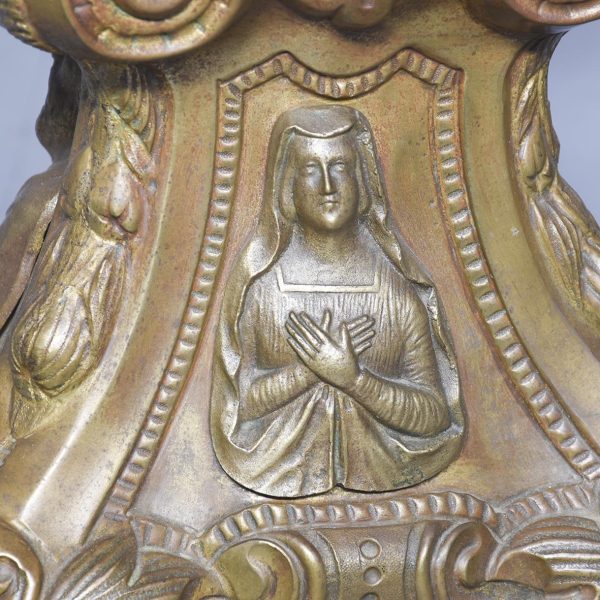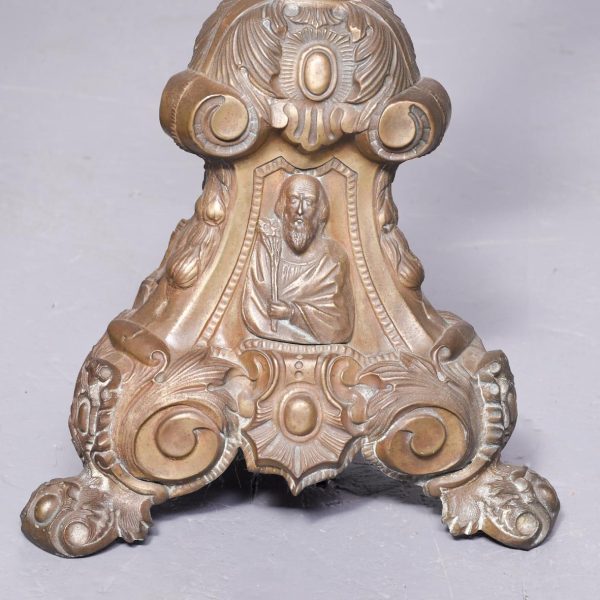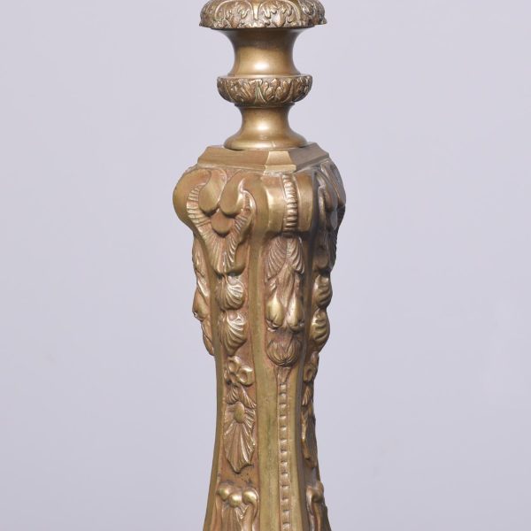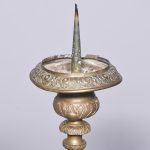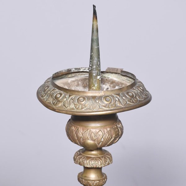 Circa 1870. A quality pair of cast brass and embossed candle holders in the Baroque style. The tops surmounted by a large brass spike, sitting on top of a shaped urn on the center with a stylish pattern on the fore edge, over a triangular shaped stem with various classic features, towards the base there are figures attached to the facings. All resting on three brass feet with scrolling sections to the side and finishing on a stylish cast brass foot