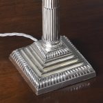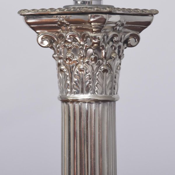 Circa 1920s. Quality pair of EPNS table lamps (recently converted). The tops to original drip trays fixed in position resting on a classic Corinthian column resting on a square stepped base on an enclosed plinth.