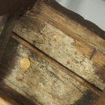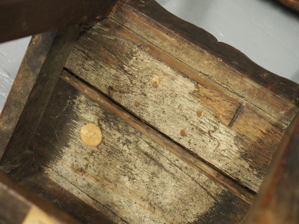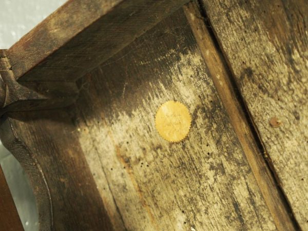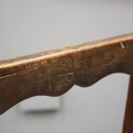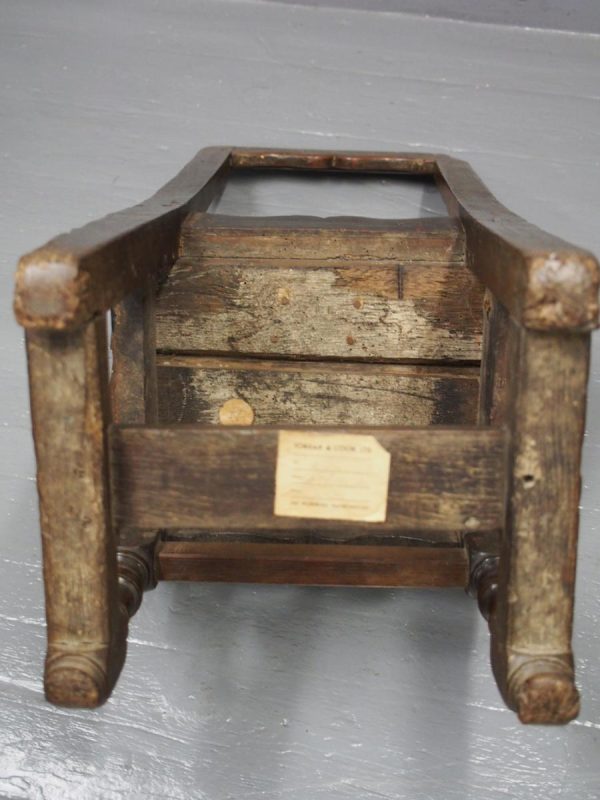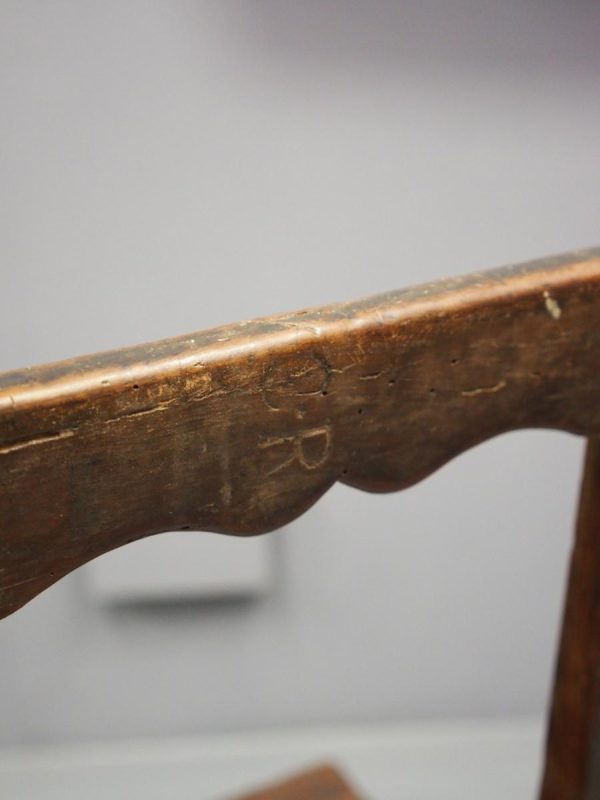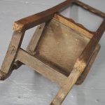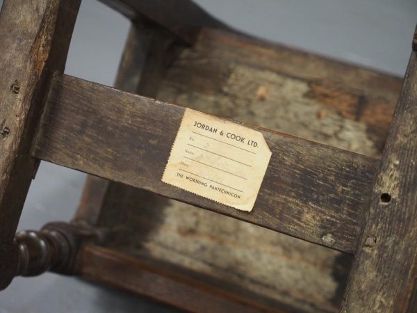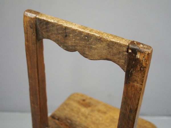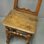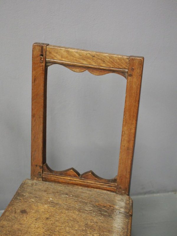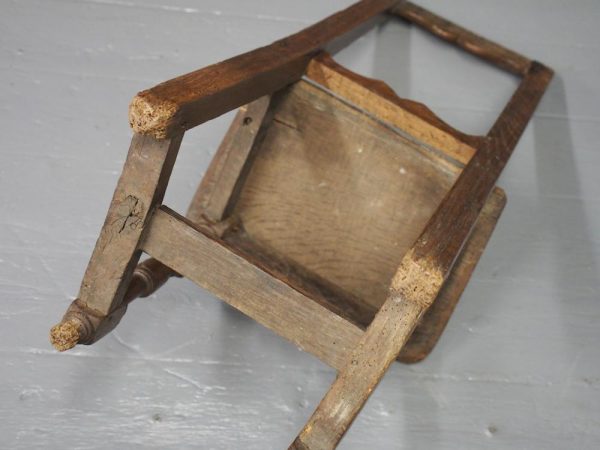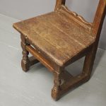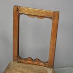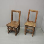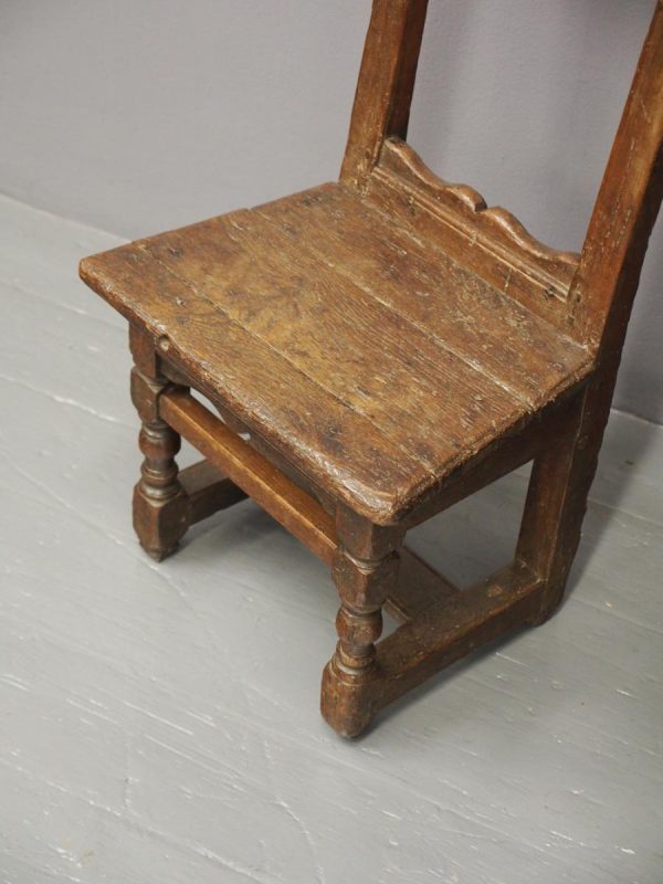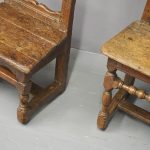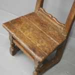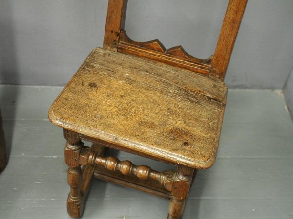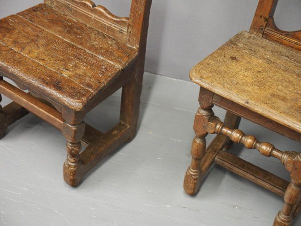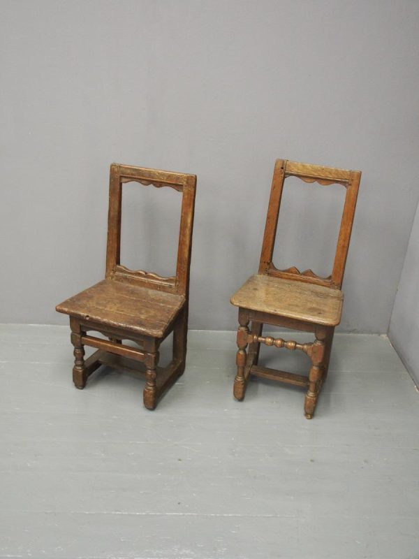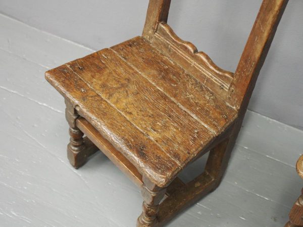 Circa 1660, pair of French oak nuns or praying chairs. With peg joints throughout, a rectangular framed back and wavy pattern to the top of the base. The solid seats have been heavily repaired and the back legs are slightly outswept with a small apron between the front legs of one chair. The front legs are ring turned and united by sturdy stretchers.