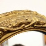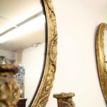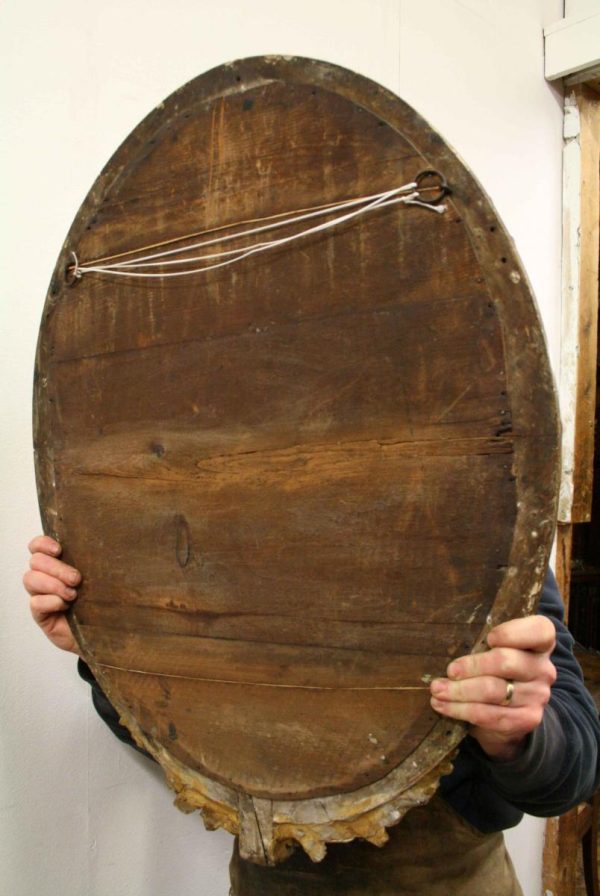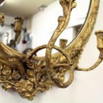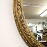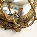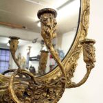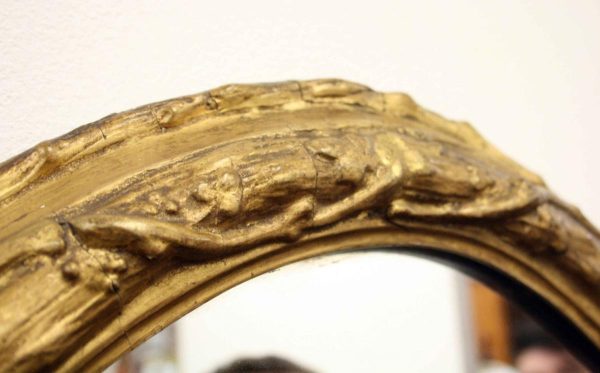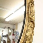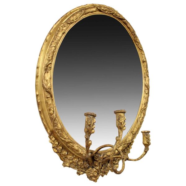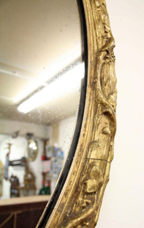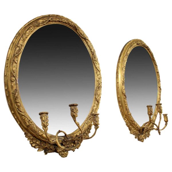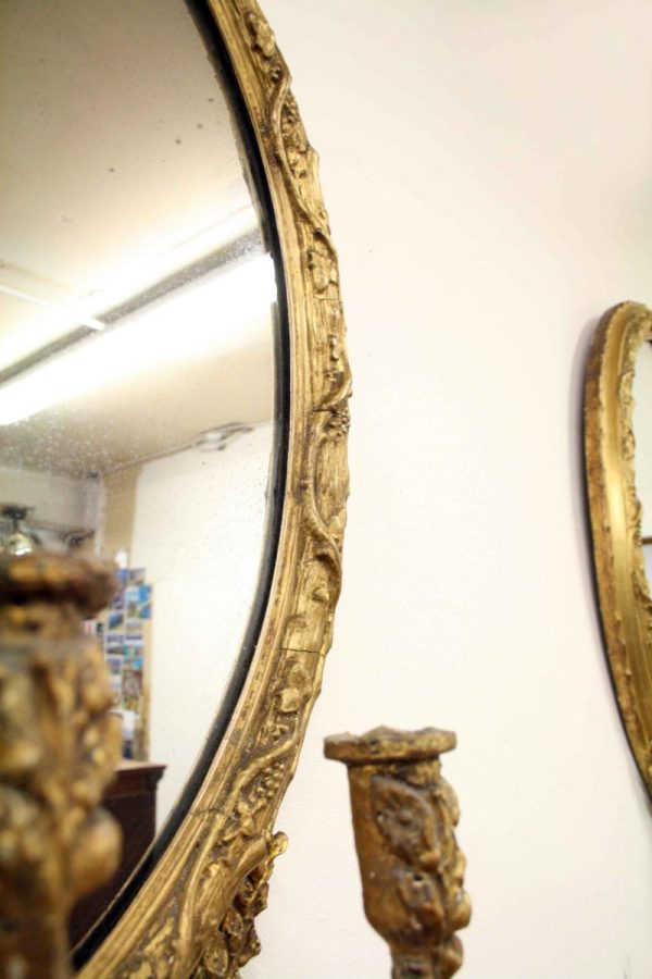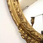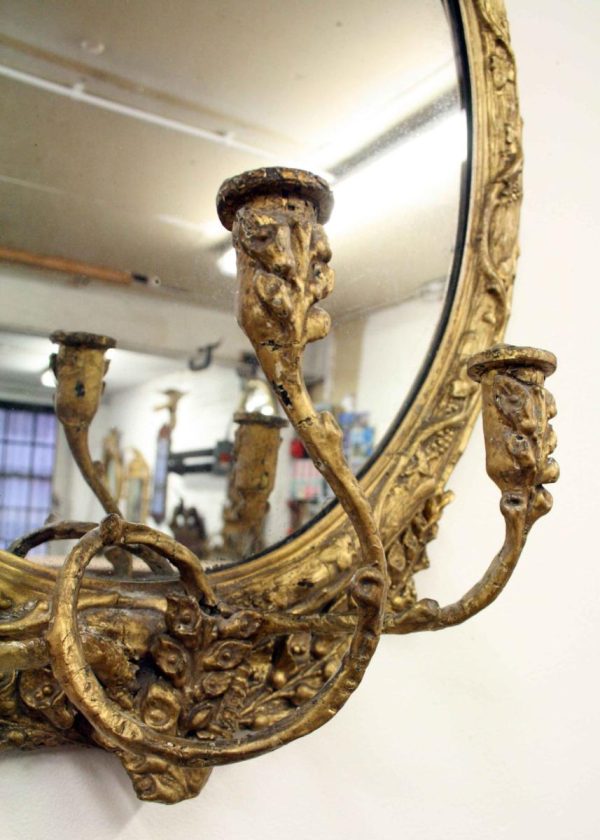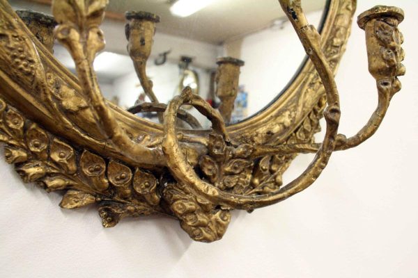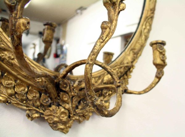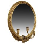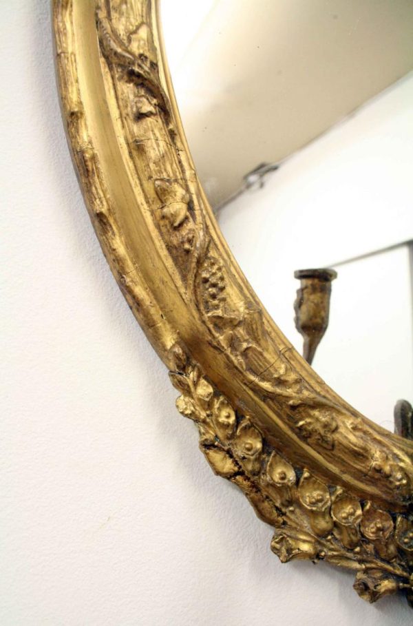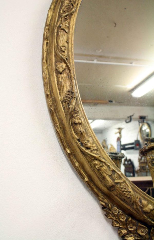 Circa 1800, pair of late George III oval carved gesso mirrors/girandole. The frame has a stylish carving of a continuous vine around the mirror, and at the base is a foliate carving from which protrude the three rustic arms to form the candleholders. The mirrors have mellowed in colour but have a good look and style about them.