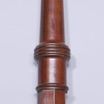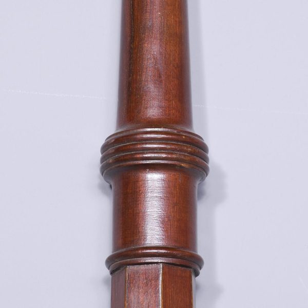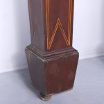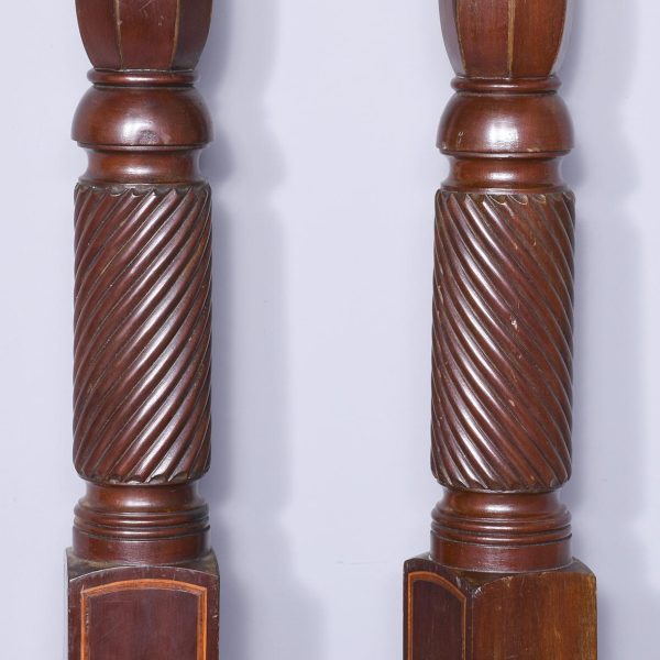 Circa 1780, pair of George III inlaid mahogany bed posts. With brass ferrule to top and spike for securing the pediment in place, and the body in a mixture of turning, ring turning, faceted and rope twisting, with string inlay to the base, over small brass plates (for bolting to the bed frame). On large, squat, spade feet, with revolving brass castors.