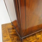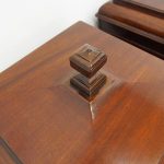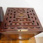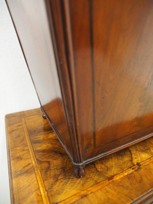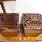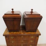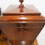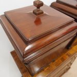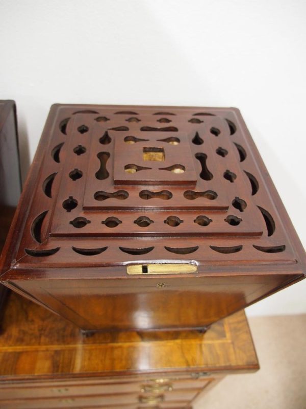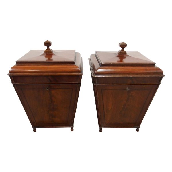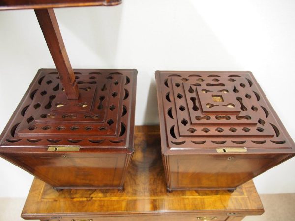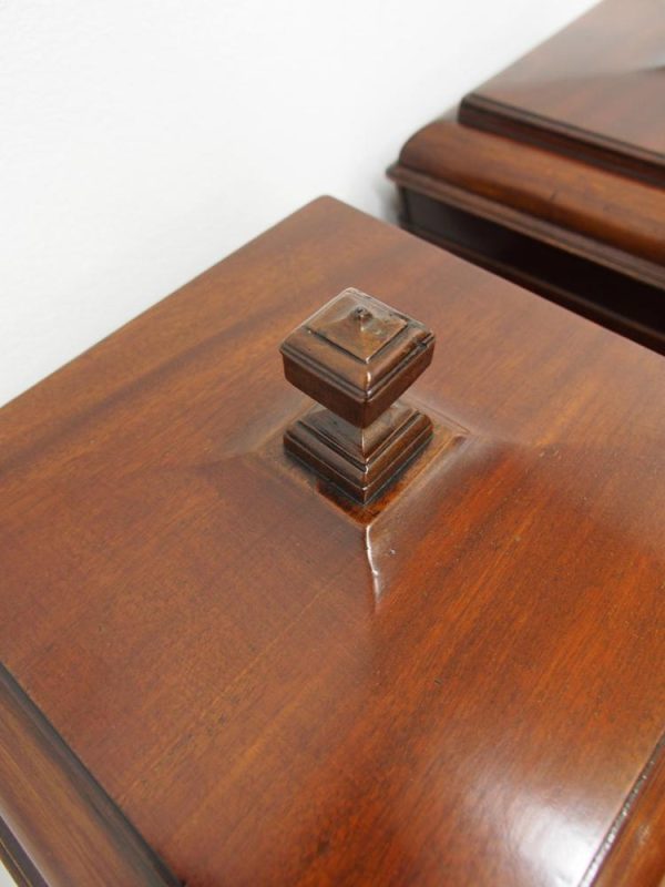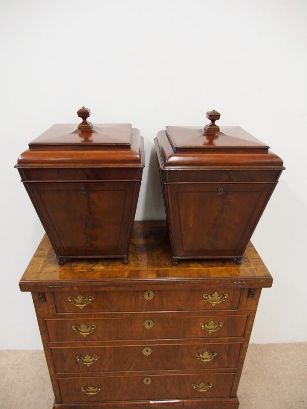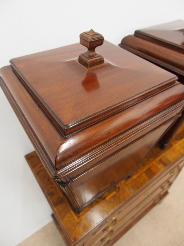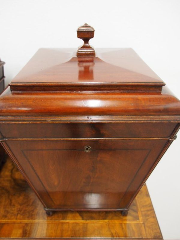 Circa 1800, a rare pair of George III cutlery boxes in figured Spanish mahogany. With a pagoda style top with a rectangular carved knob. The boxes have a tapering design and are finished with ebony inlay. There are fluted corners on both boxes, and they have neat bun feet. They have their original fitted interiors.