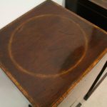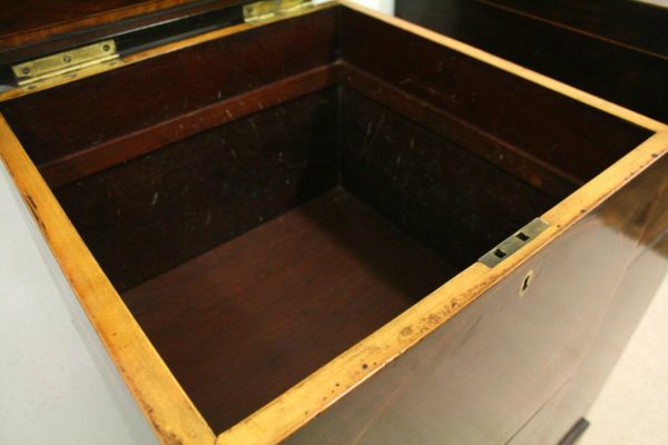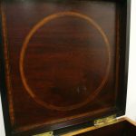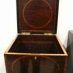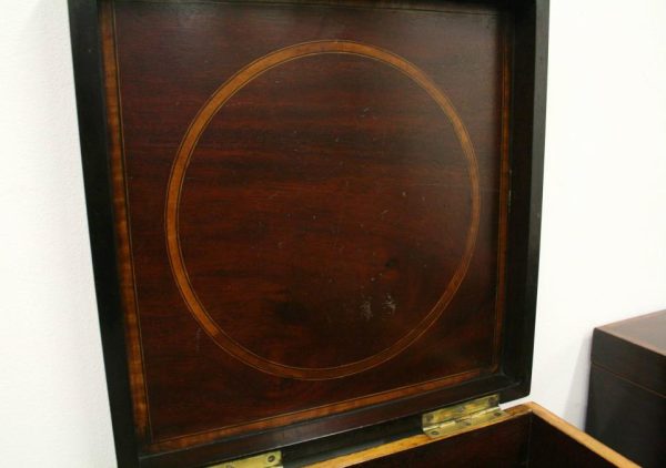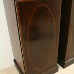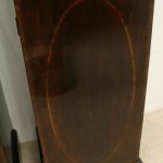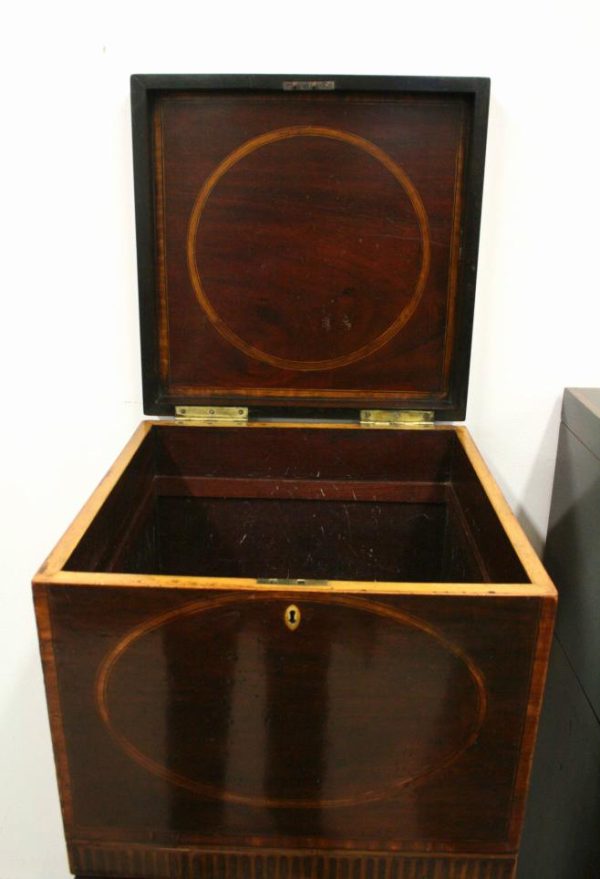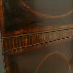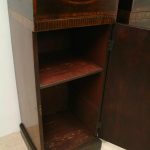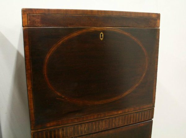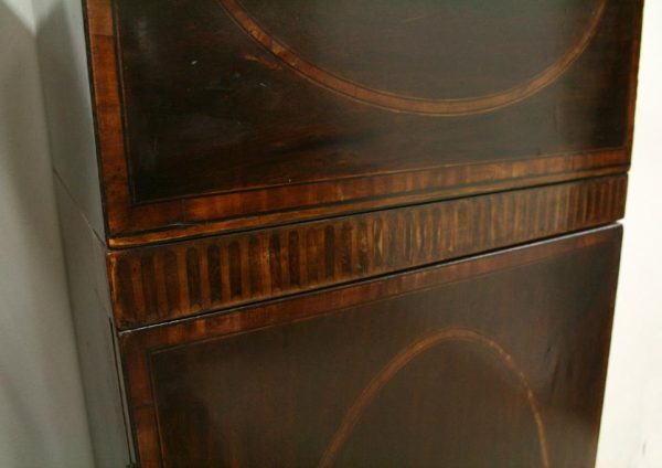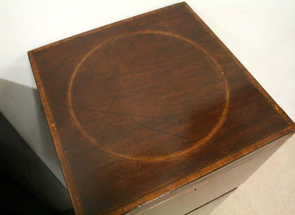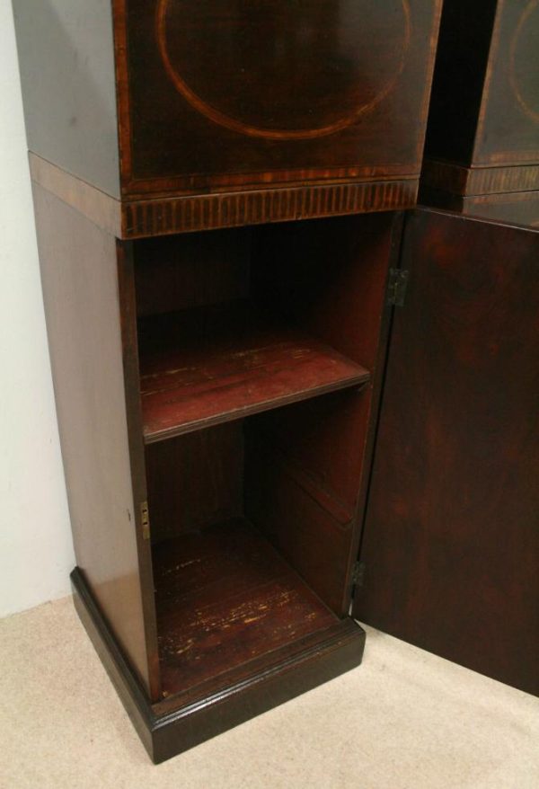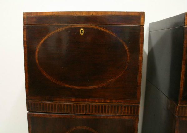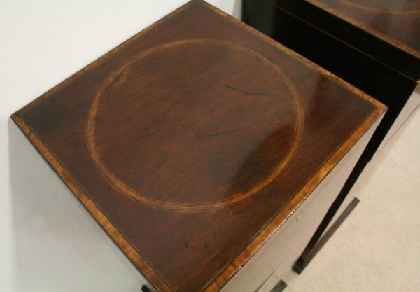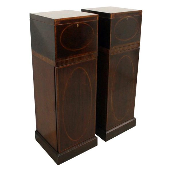 Circa 1790, very unusual tall pair of George III mahogany and inlaid dining room pedestals. The tops are hinged and open to reveal an open section within, which could have been used for holding bottles or tureens. There is a circular inlay on the top, crossbanded with satinwood and ebony, and this occurs again on the front and on the large cupboard below in a larger oval shaped version. Between the top and bottom section there is a crossbanded inlay in the form of faux fluting. The bottom cupboard opens to reveal adjustable shelves. There is an ogee moulding beneath and the whole piece stands on an enclosed plinth. These type of pedestals would often come with a serving table in the centre, but could be used for display, statuary or lamps.