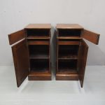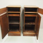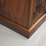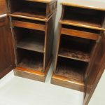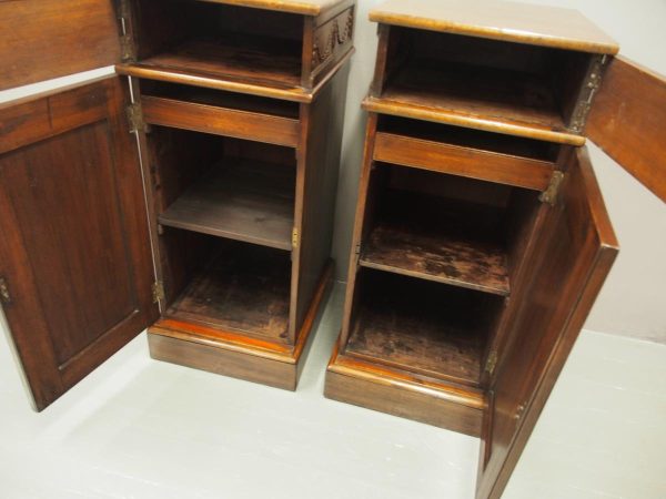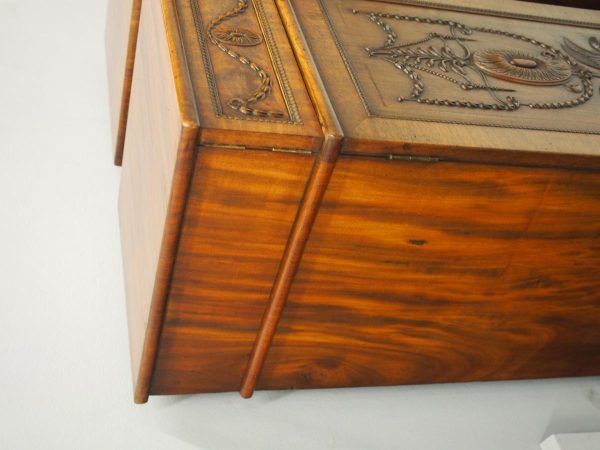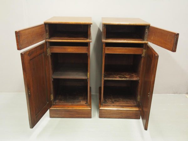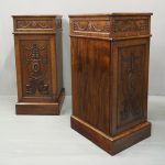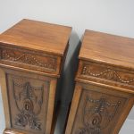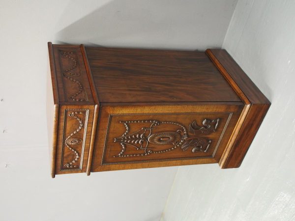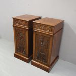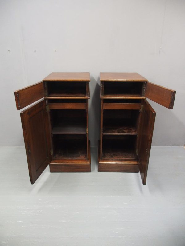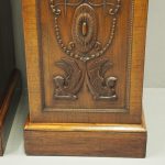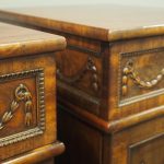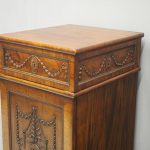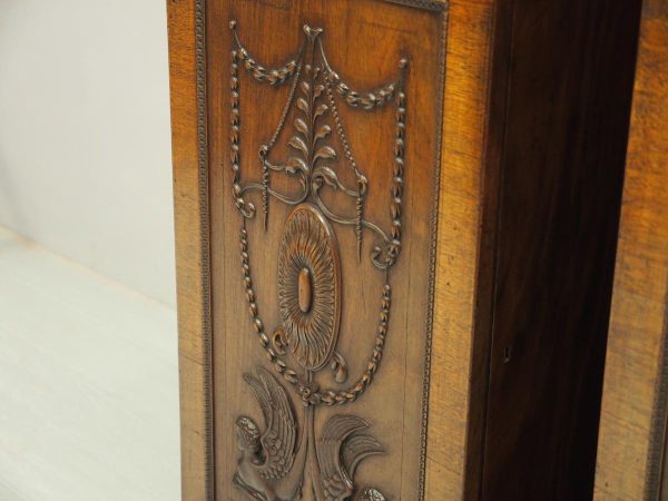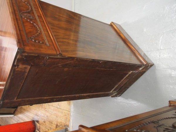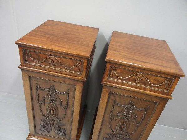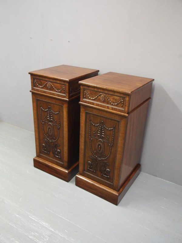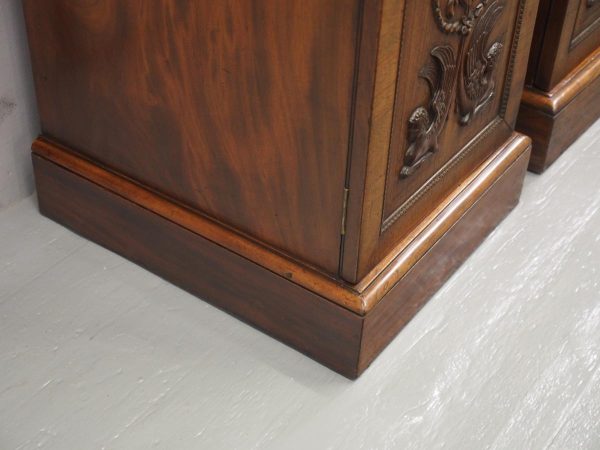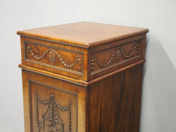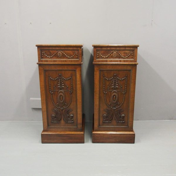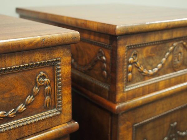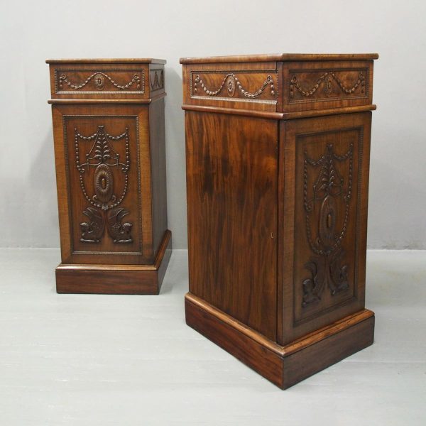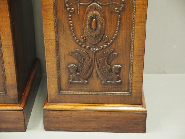 Circa 1800, pair of George III, Adam-style mahogany pedestals. The rectangular top is in figured Spanish mahogany with cross-banded fore-edges and over frieze drawers with neoclassical oval paterae and husk chains. There are similar decorations on one side of the pedestals. The cupboard doors have large, carved central paterae with husk chains, above a pair of griffins. All standing on moulded enclosed plinth bases.