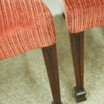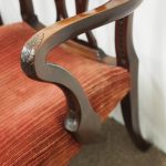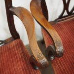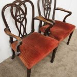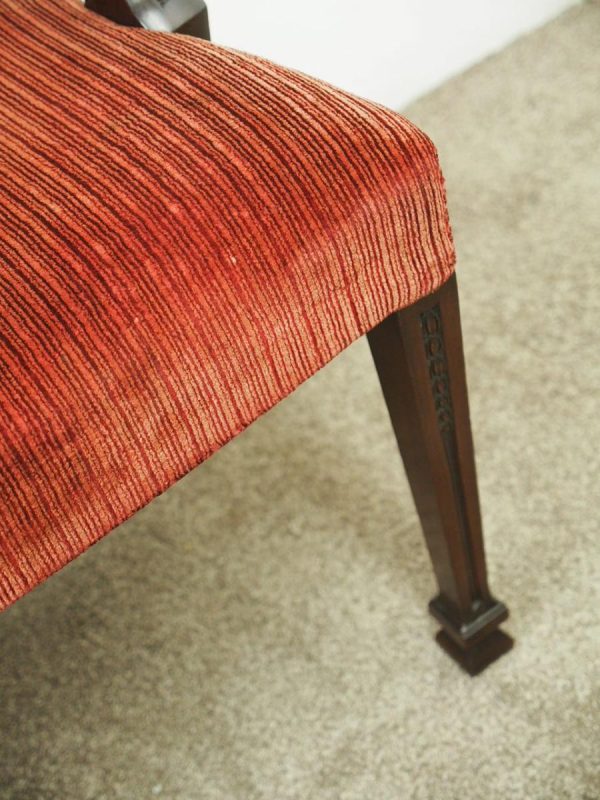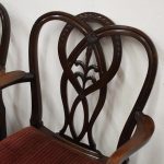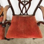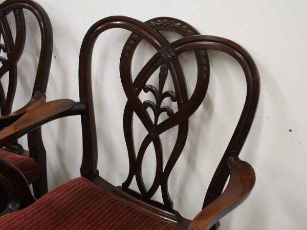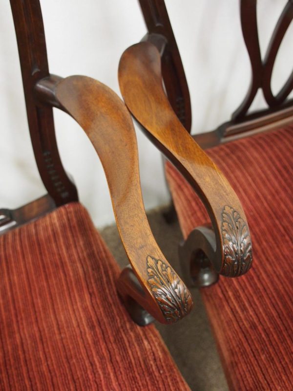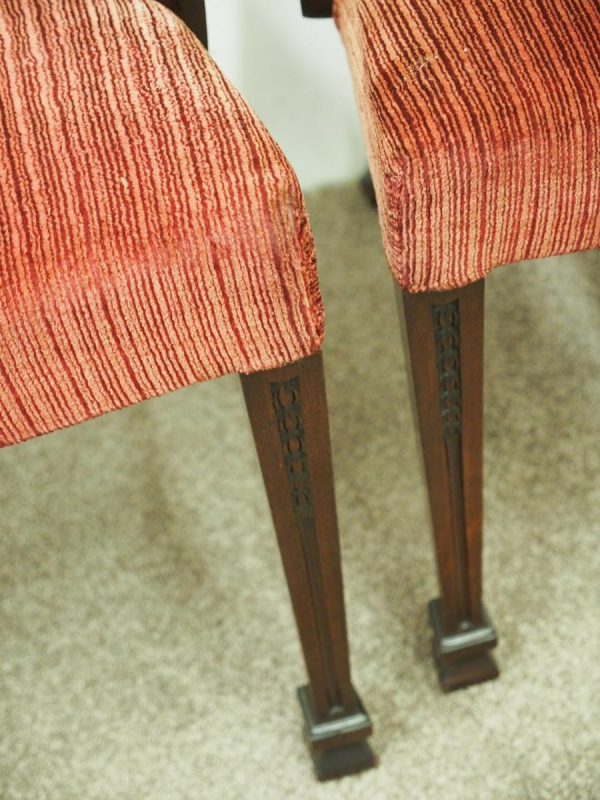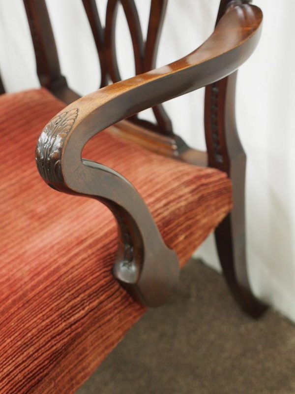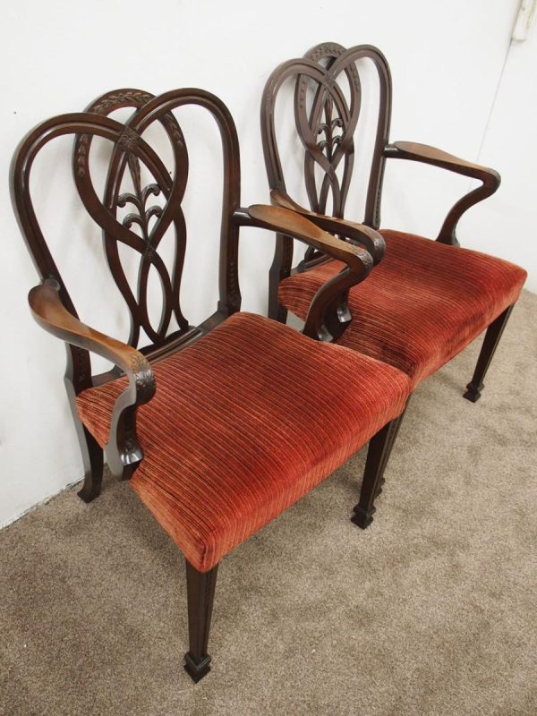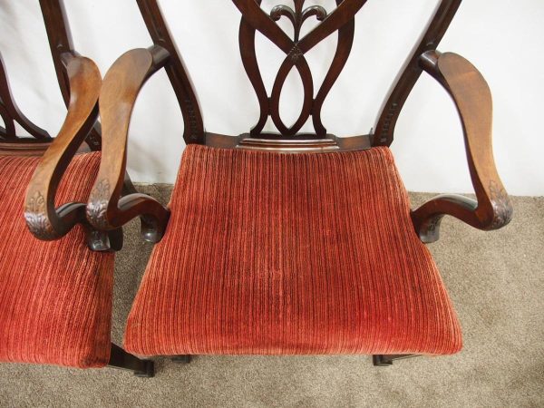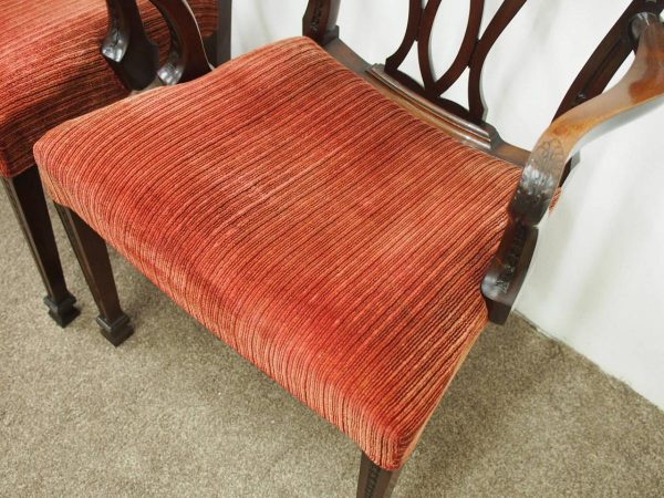 Circa 1900, pair of George III style mahogany arm chairs. The chairs are stamped on the inside back leg, Howard and Sons Limited, Berners Street with the reference number 8661651. Both clean and sturdy.