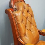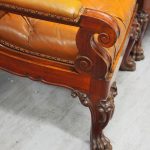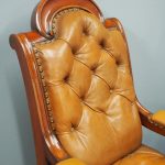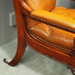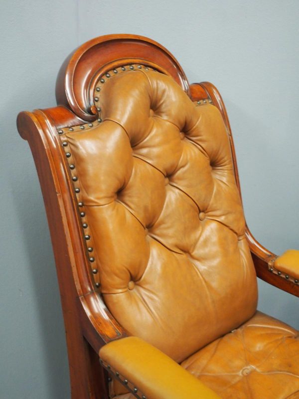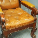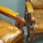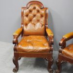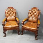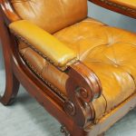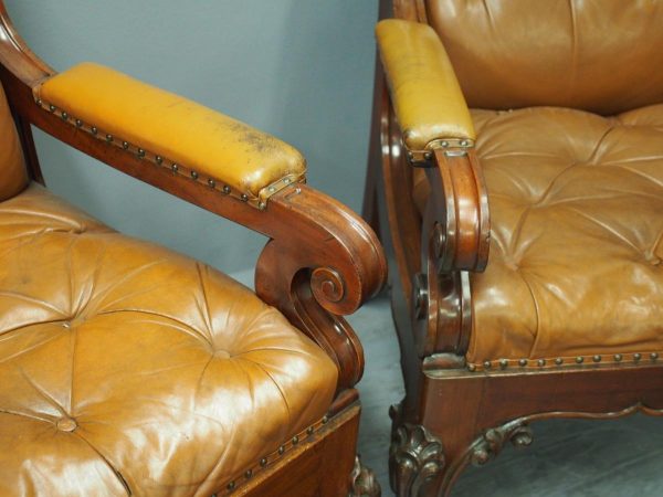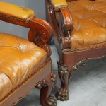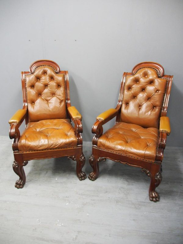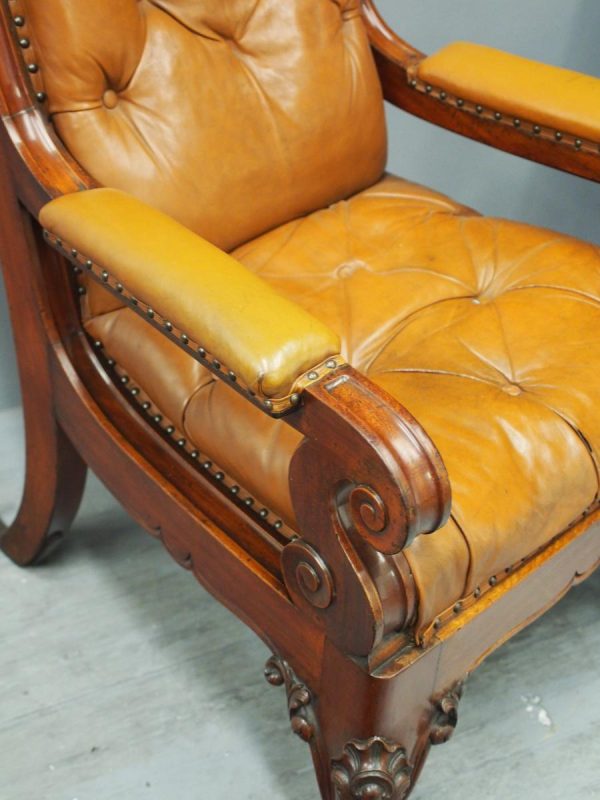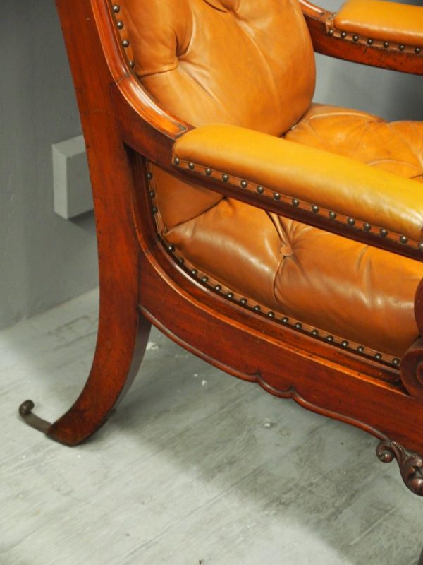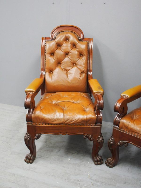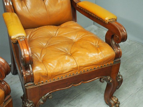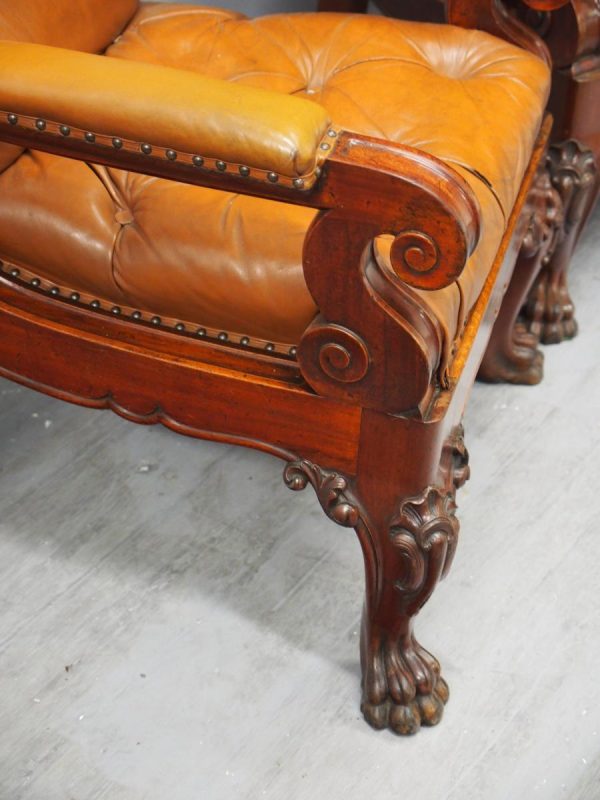 Circa 1830, pair of mahogany and leather upholstered club armchairs, in the manner of Thomas Colquhoun of Glasgow. With arched tops finishing with a C scroll, the generous moulded frame has a deep buttoned back and seat upholstered in a light brown/tan leather. The arms are upholstered in matching leather and held in place by scrolling supports, with a carved apron beneath the seat and sides, simulating a beaded edge. With outswept back legs finishing on scrolling metal feet (allowing the chairs to move with ease). The front legs are well carved with foliate designs, c-scrolling and finish on a hairy paw foot.