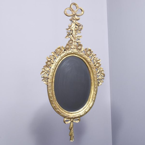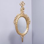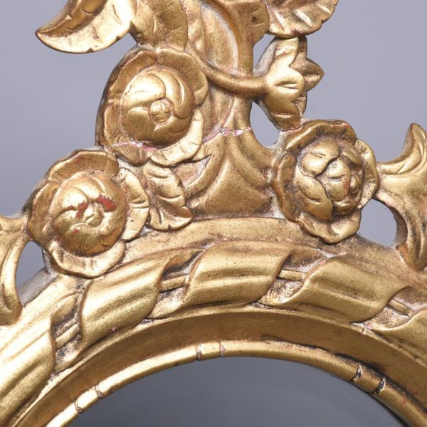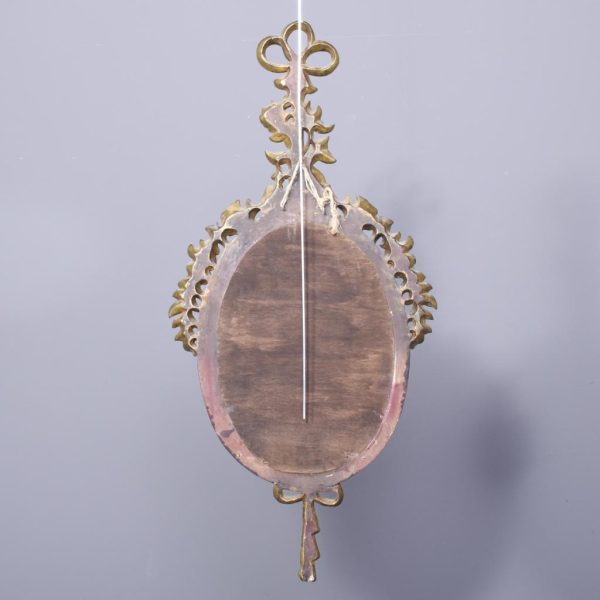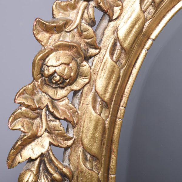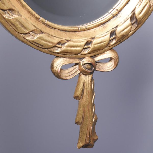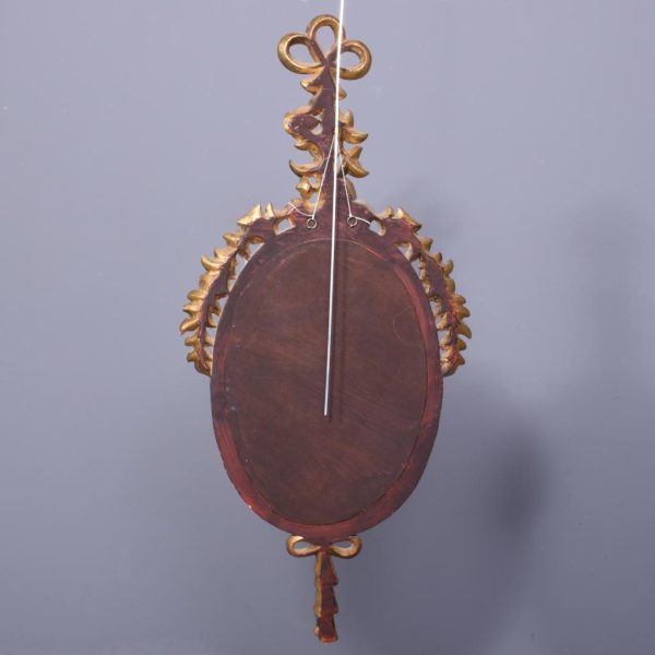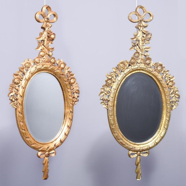 Circa 1970. Pair of Georgian-style hand carved giltwood mirrors. Surmounted by a carved bow on a floral decorated column, the oval beveled glass mirrors within a moulded frame with neo-classical decorations with foliate swags around the upper half, the base with a further carved ribbon bow. Hand carved and gilded in the Georgian style.