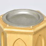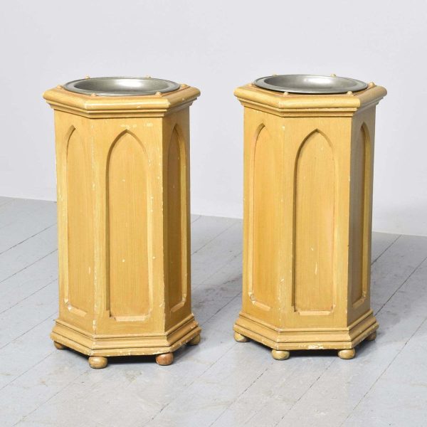 Circa 1870 a good pair of painted gothic style stands, with pewter plates to the top.  Each of the plates are stamped, “Made in Sheffield” the hexagonal shaped pedestals with the six small roundels on the top, moulded foredge and 6 Gothic panels, base with further moulding and each stand rests on six squat bun feet, stylish and elegant.
