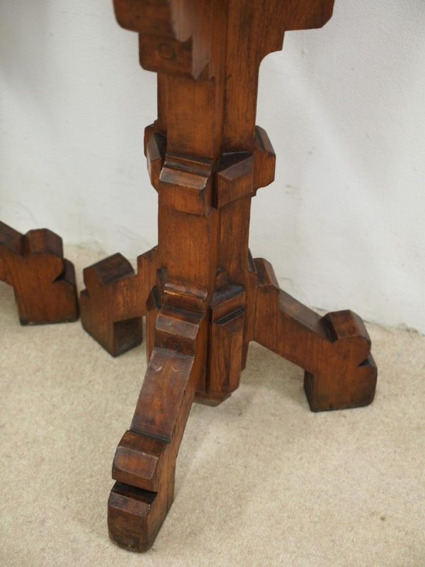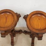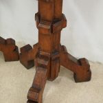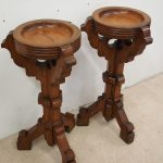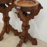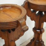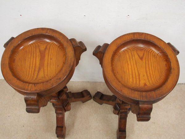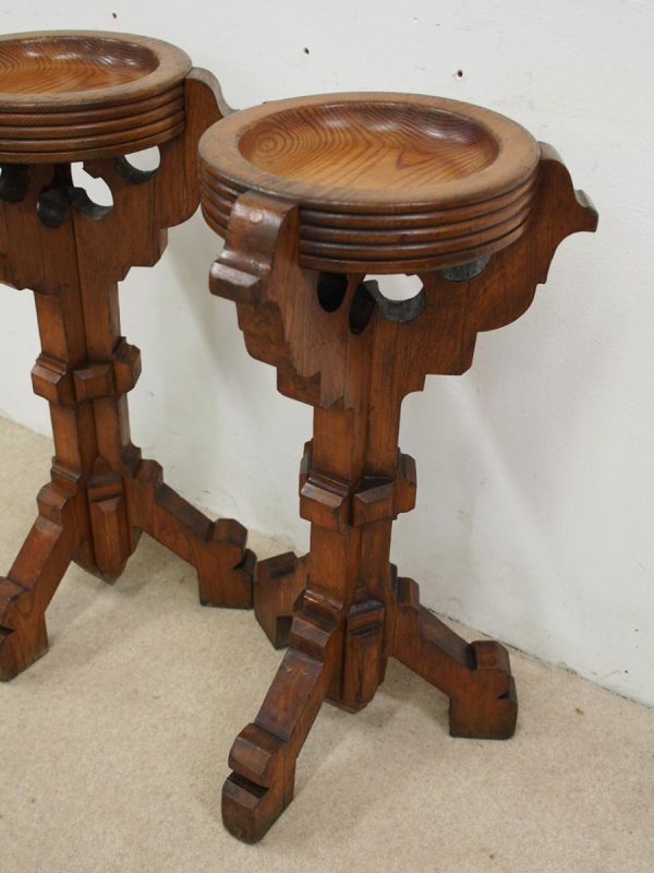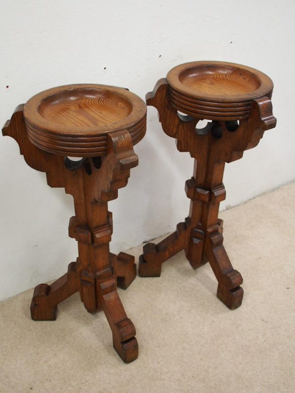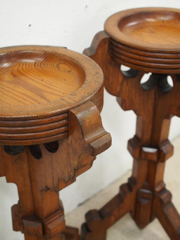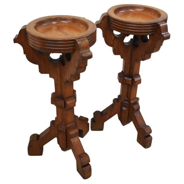 Circa 1870, pair of Gothic style pitch pine stands or church collection bowls/fonts. The circular dish tops are supported by three Gothic architectural style supports that then join to form a stem. These then splay out as a stepped tripod base.