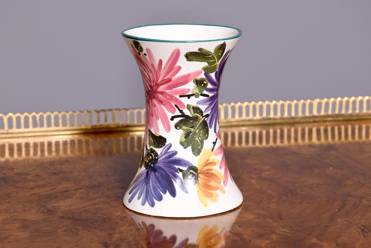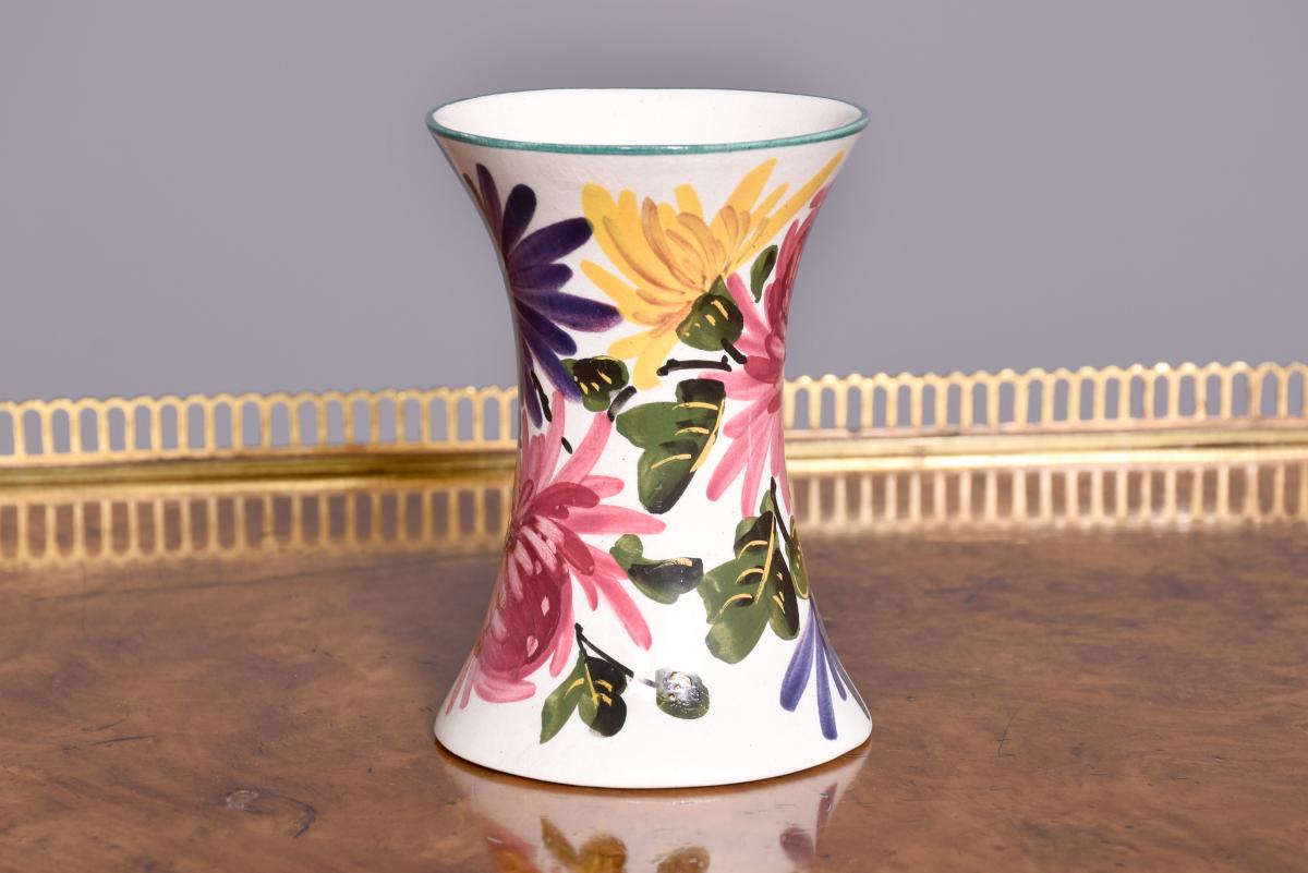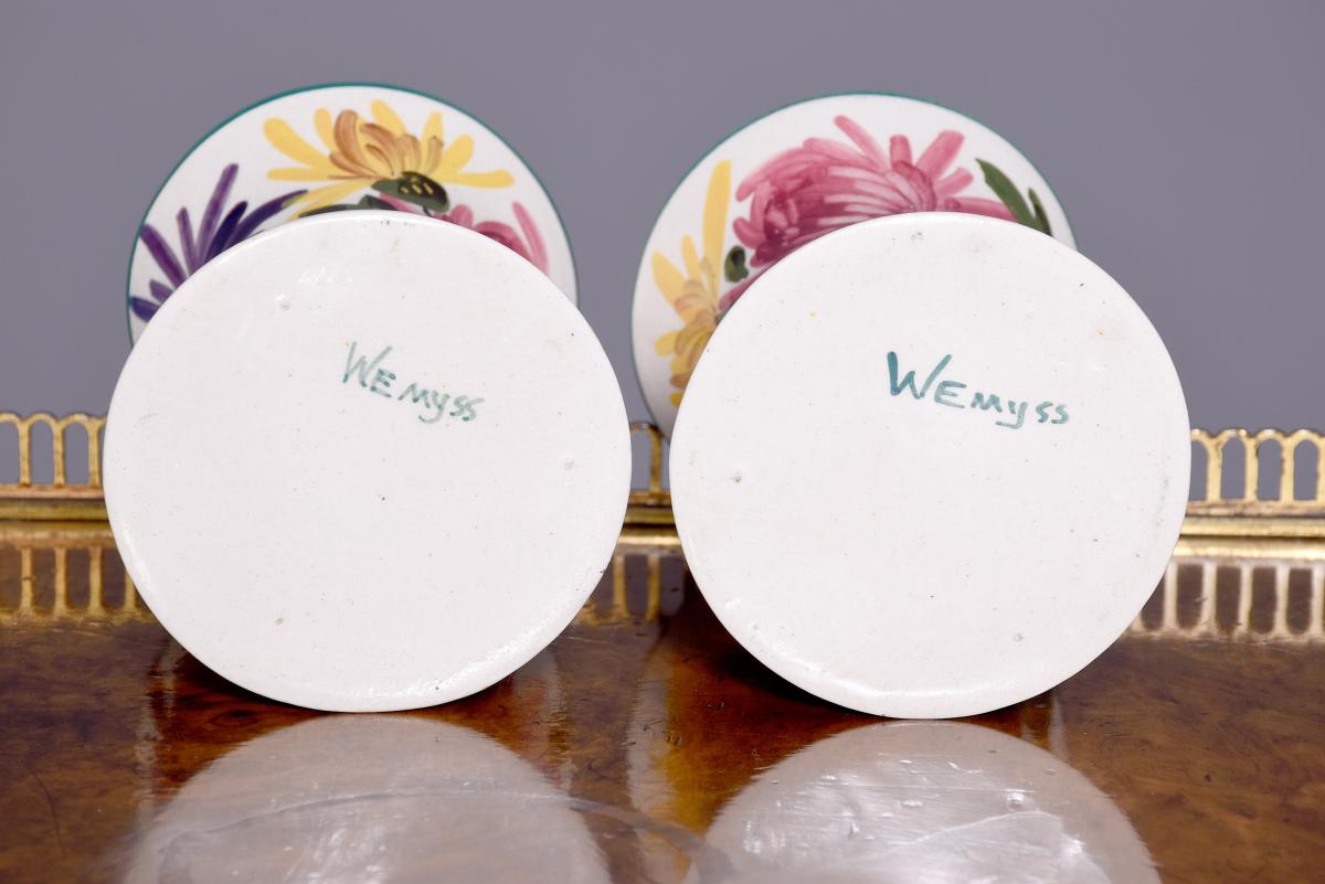 Circa 1900. A lovely pair of hand painted beaker vases by Wemyss, of typical form with the green painted rim, both hand painted with chrysanthemums and signed on the bottom, painted by two different artists. The signatures appear to be of ‘Karol Nekola’ and ‘Sandland’.