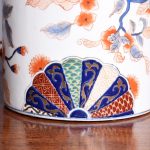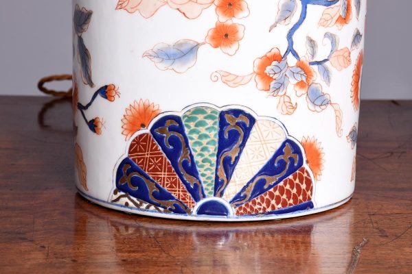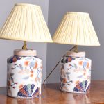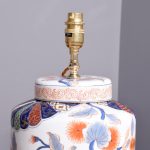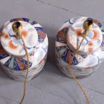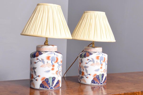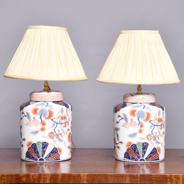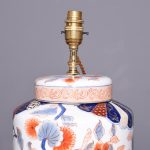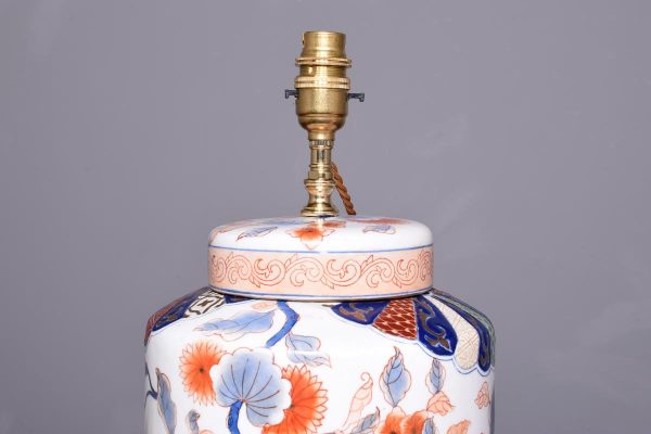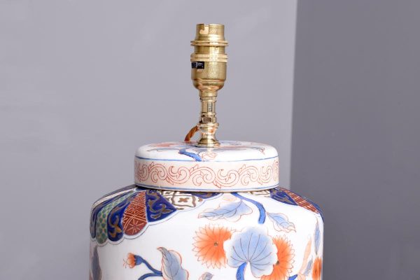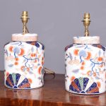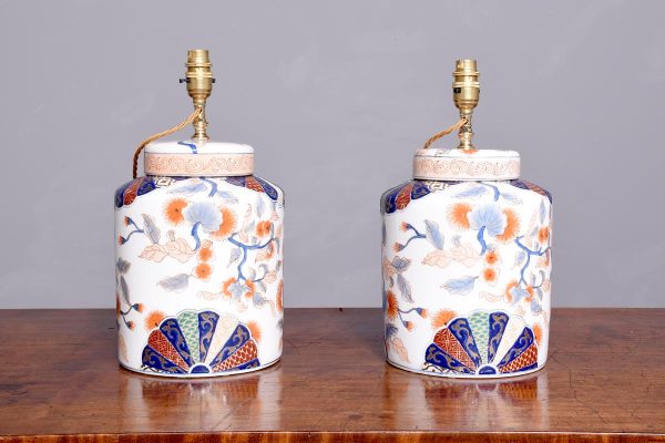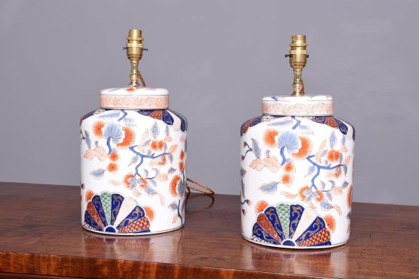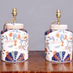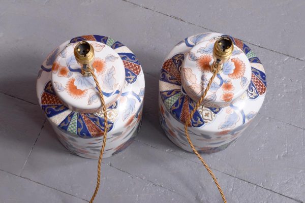 Circa 1970. A pair of lidded ginger jars in the Imari style, recently converted into table lamps, the tops moulded by a brass lamp holder with fabric covered flex, the circular body with classic Imari patterns and rich coloring.