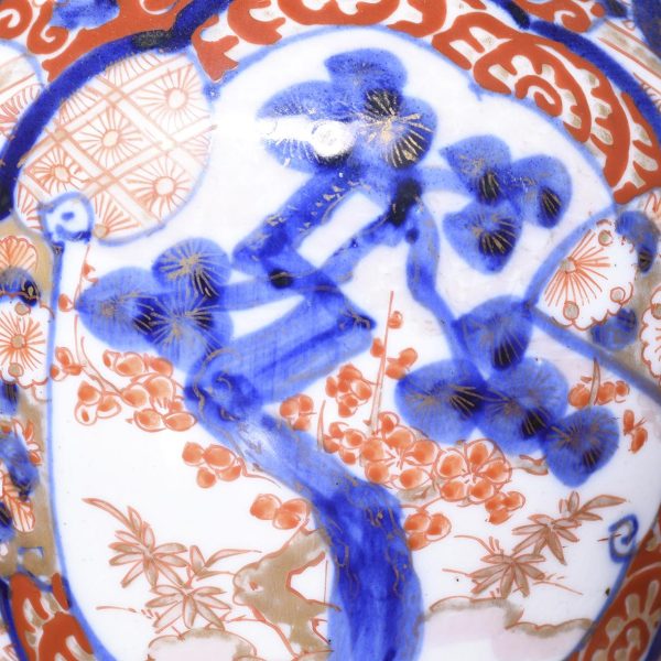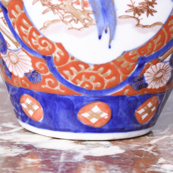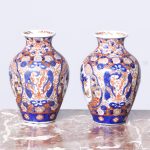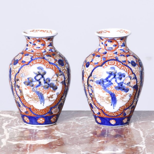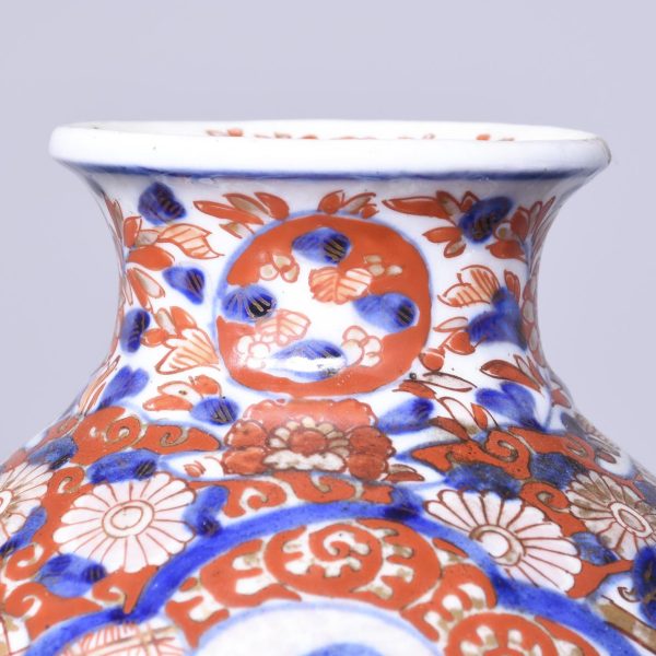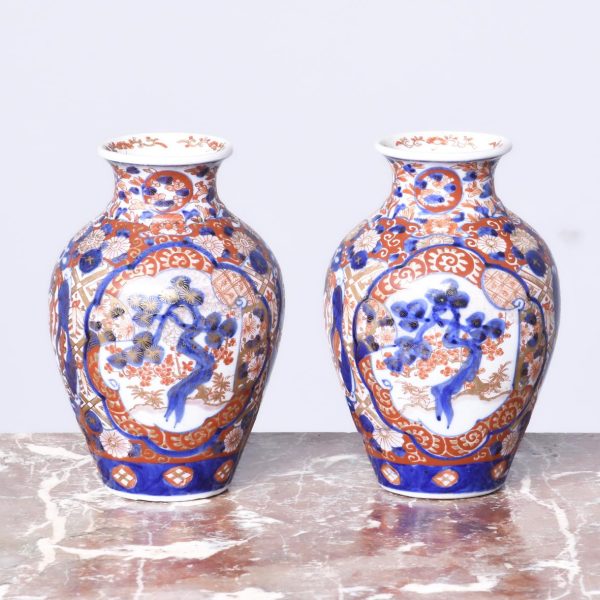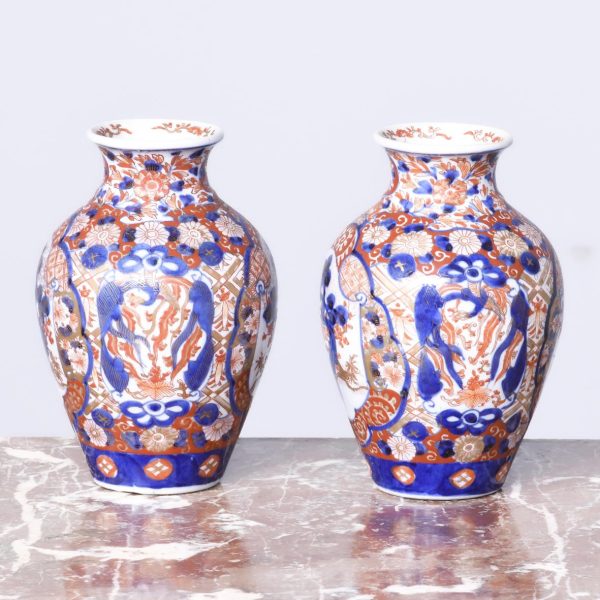 Circa 1900. A pair of Meiji period Imari vases. The neat size bulbous shaped vases with flared necks with decoration on the inside, bodies painted in typical Imari patterns and styles. The condition of the vases is excellent, with the vibrant colours not faded.