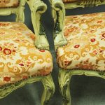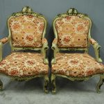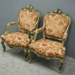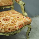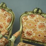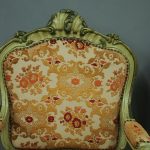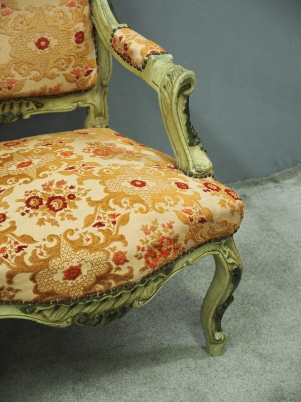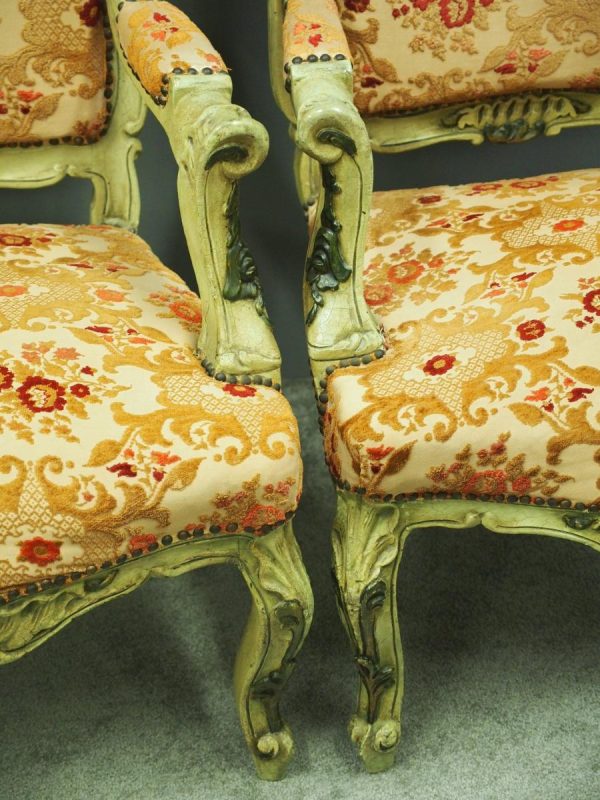 Circa 1920s, pair of Italian painted and carved armchairs. With shaped back with foliate top rail over upholstered back, arms and seat in a hand cut, patterned fabric with brass studding. With further foliate carving to the shaped arm supports, seat rail and cabriole legs.