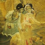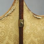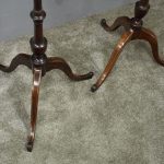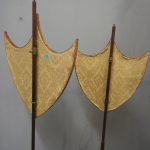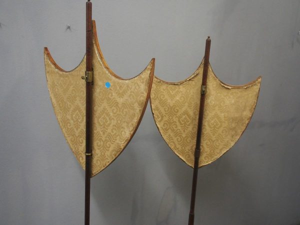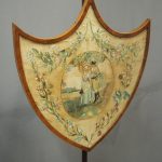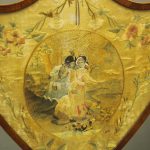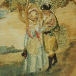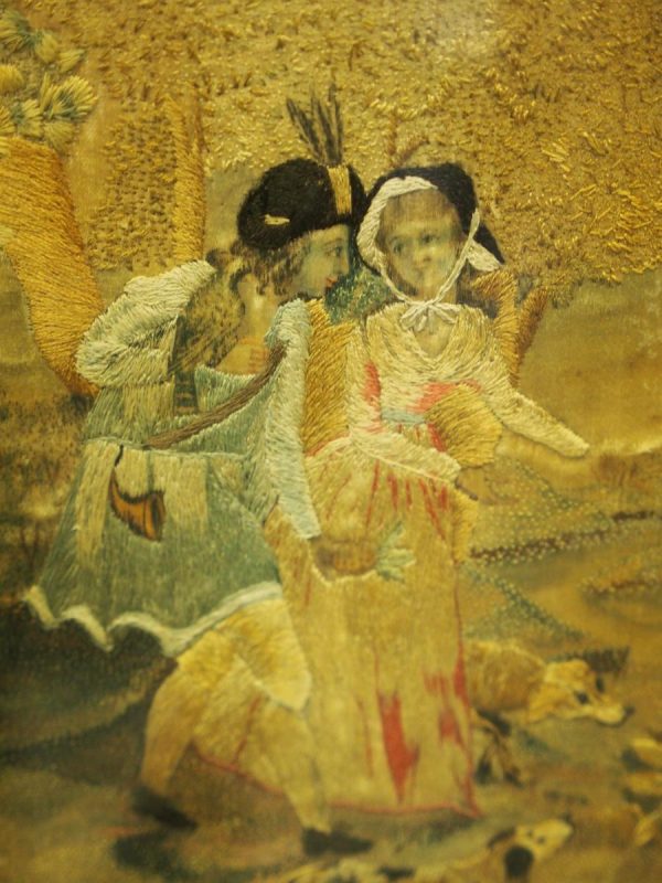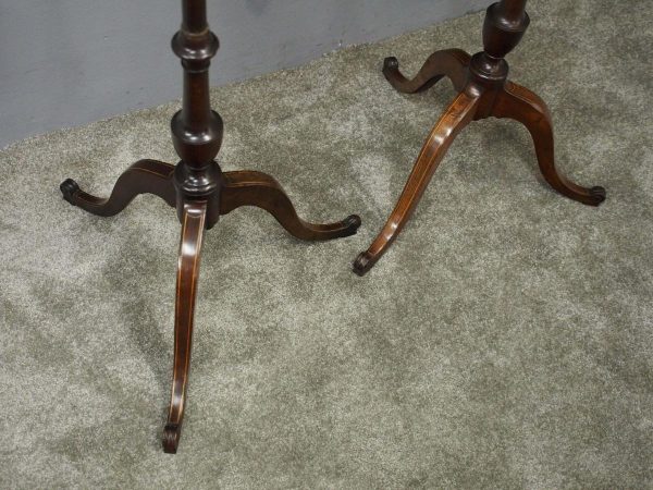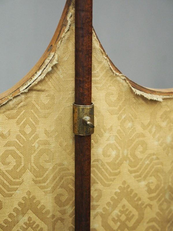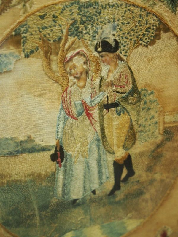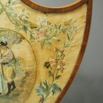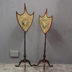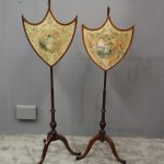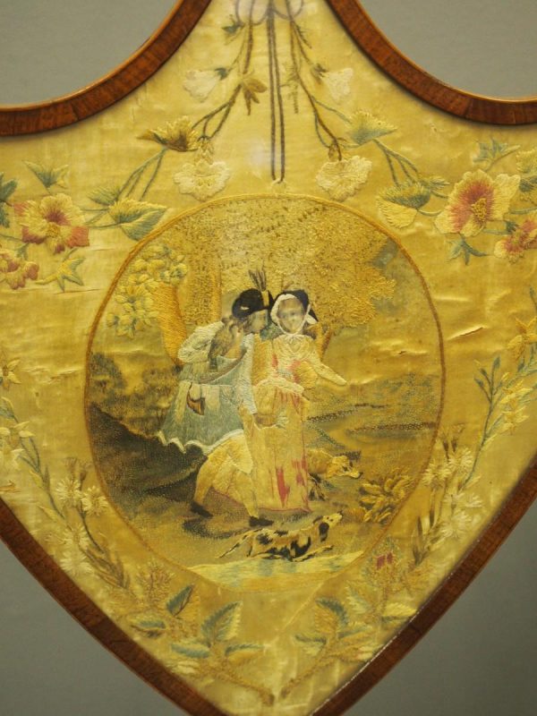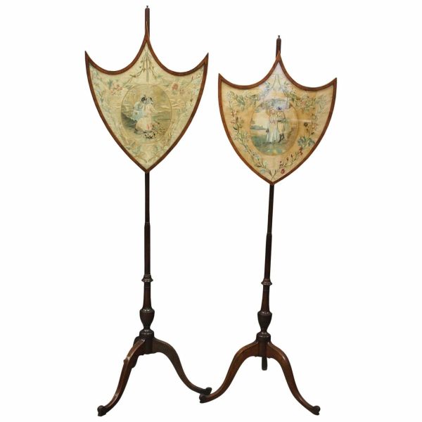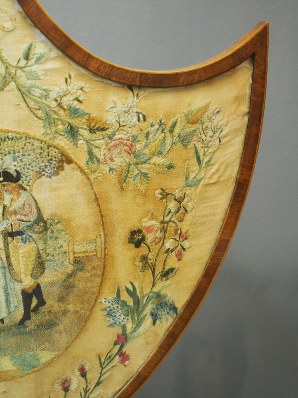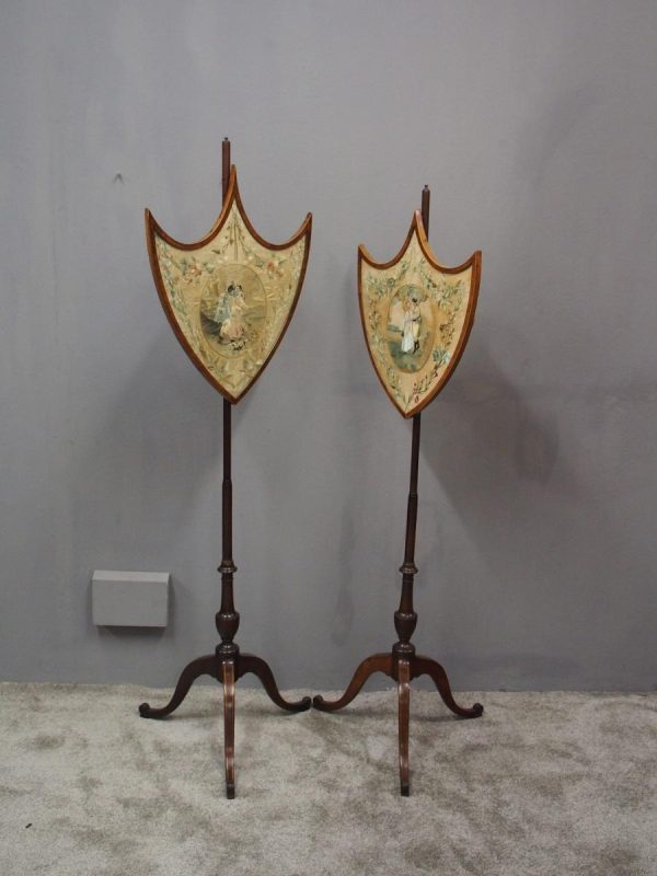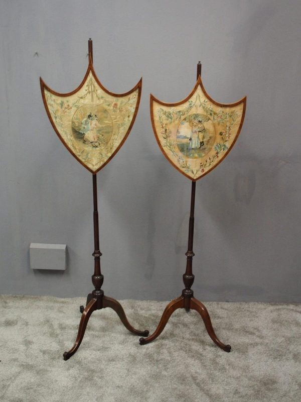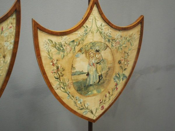 Circa 1800, pair of late George III mahogany pole screens. The thin uprights have a shaped heraldic frame in crossbanded mahogany with boxwood edging, and a hand-embroidered silk scene of a couple in the woods with a dog and a couple in a garden. Each scene is surrounded by similarly embroidered swags, tails and ribbons, all with glazed fronts. The bottom of the uprights has an urn shaped stem, on an inlaid tripod base with scrolling legs, finishing on a curled toe.
