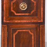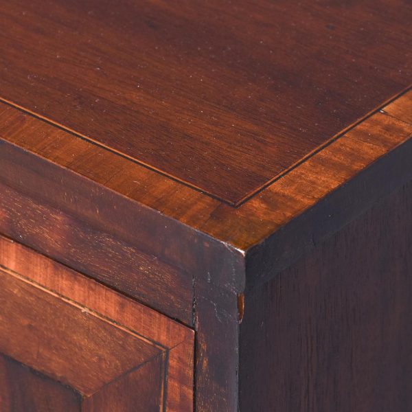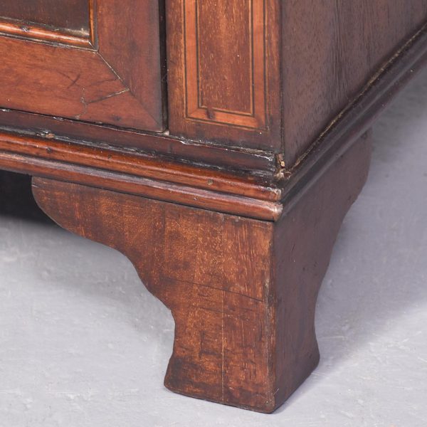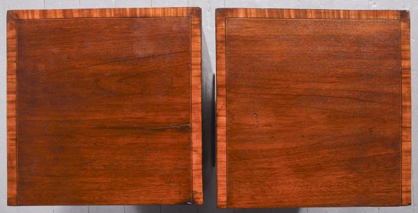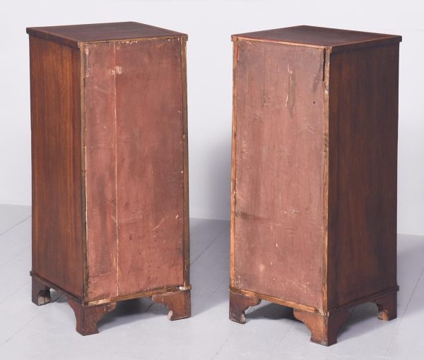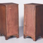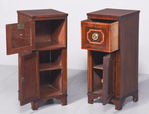 Circa 1820 with adaptations. Pair of late Georgian inlaid mahogany pedestals. The rectangular tops with satinwood, boxwood and ebony inlay above frieze drawers with matching inlay and original ormolu handles and shelved cupboards with matching inlay, all supported on shaped bracket feet.