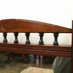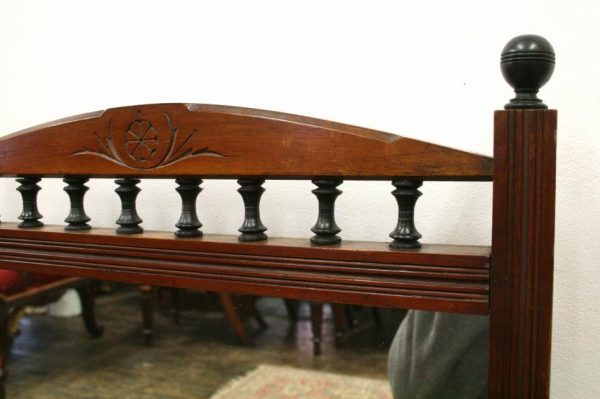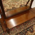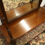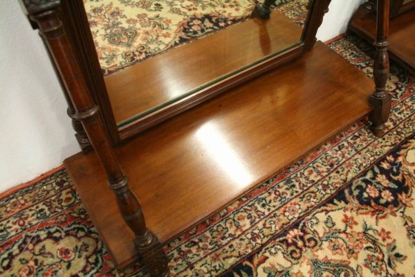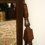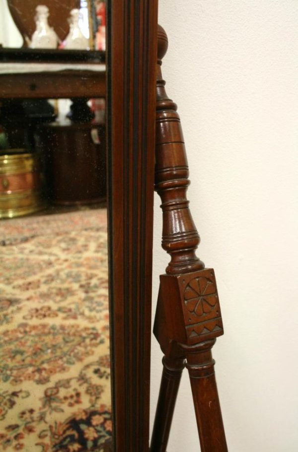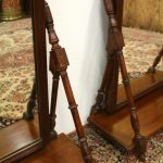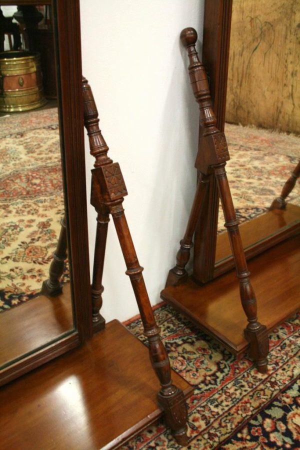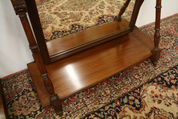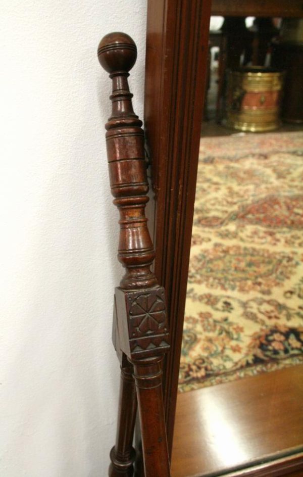 Pair of late Victorian mahogany dressing mirrors of unusual form the rectangular mirror surmounted by a spindle gallery and carved frieze, supported by two turned uprights.