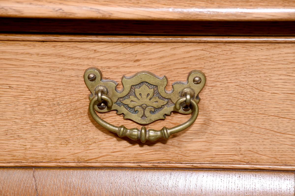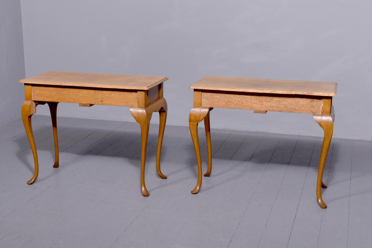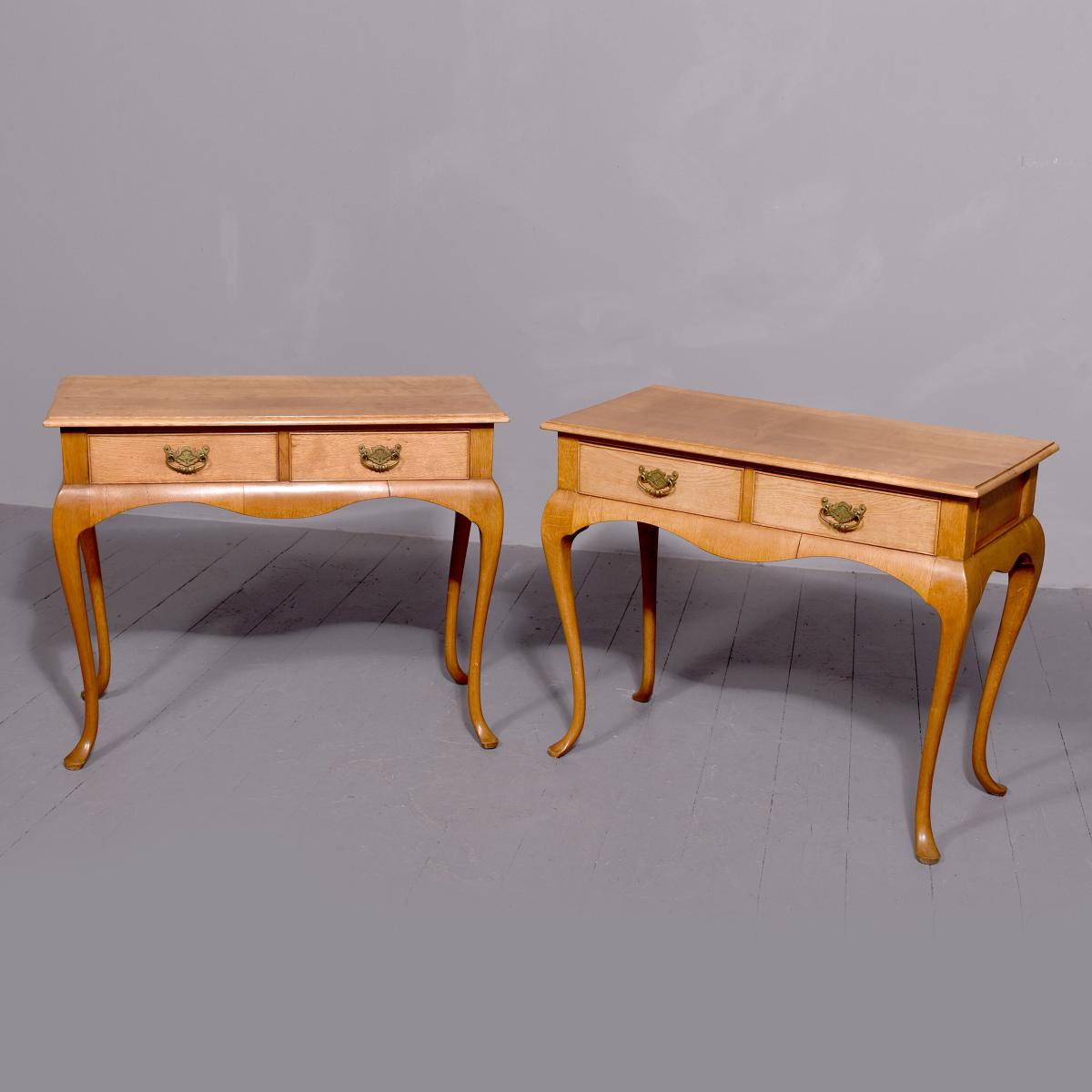 Circa 1920s. A stylish pair of Queen Anne style oak two drawer side tables, the solid tops in quarter sawn oak with an elegant moulded fore-edge, pair of drawers at the front with cock beadings and cast brass and pierced handles, the liners in solid oak, beneath the drawers is a shaped and curved frieze to the front and sides, all supported on four elegant cabriole legs finishing with a stylized pad foot, both with mellow colour.