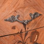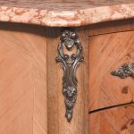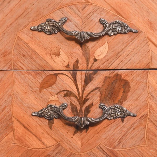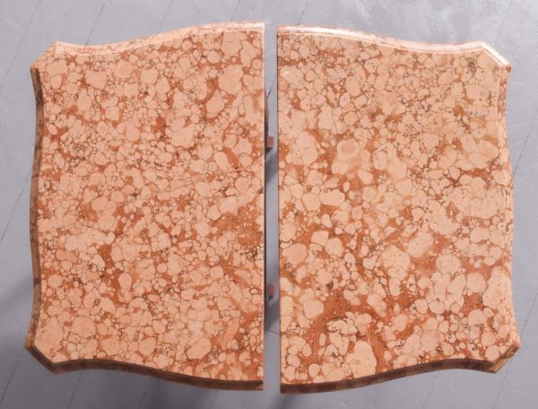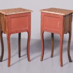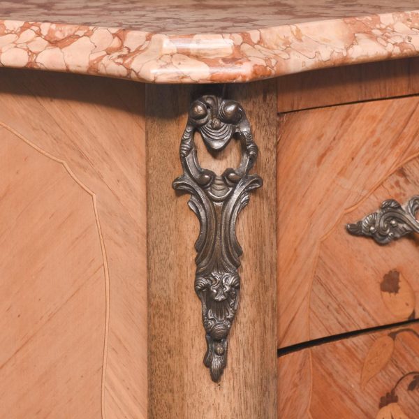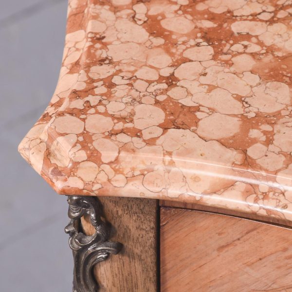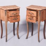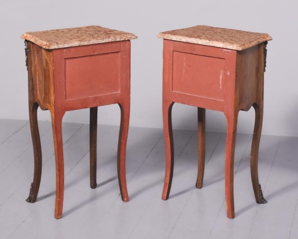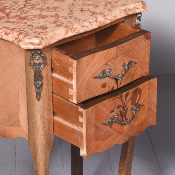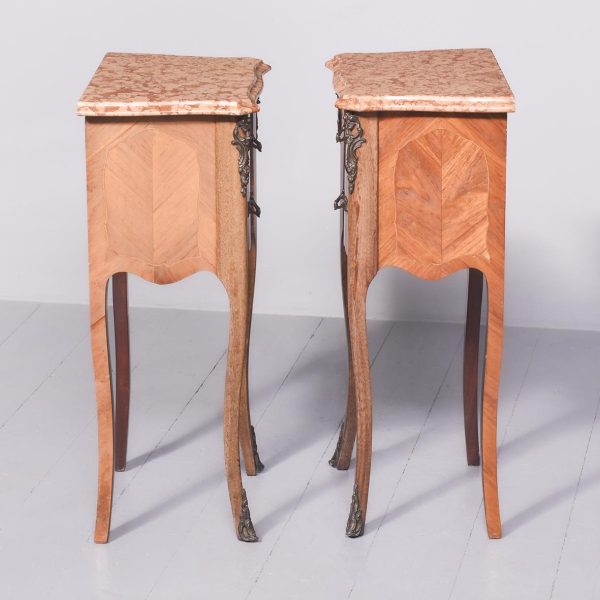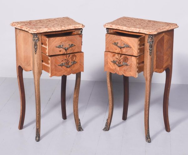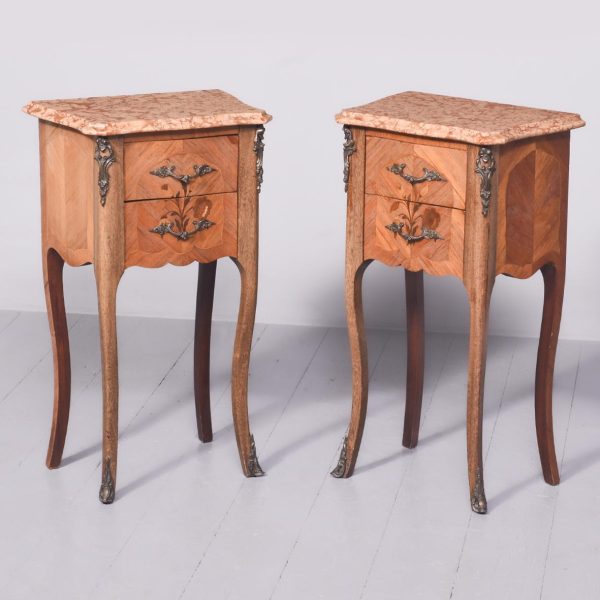 Circa 1960. Pair of Louis XV style kingwood and walnut marble top bedside lockers/lamp stands. The serpentine shaped variegated pink marble tops above two drawers with marquetry decoration and bronze handles. Supported on cabriole legs with bronze mounts and sabots.